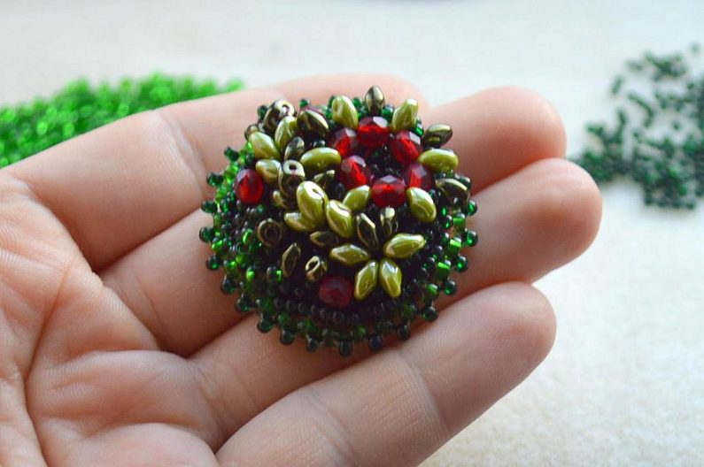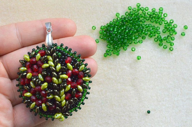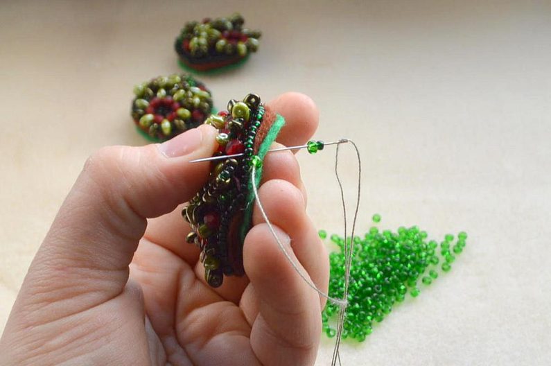 Začnu s obšíváním. Navleču jeden korálek velikosti 8/0 – vpíchnu do podložky a protáhnu ho odspodu ven. Dále navlékám malý a velký rokajlový korálek, vpichuji do okraje a protahuji vždy ten velký. Pokračuji kolem dokola. Na závěr jsem si vytvořila ještě očko ze 4 korálků.