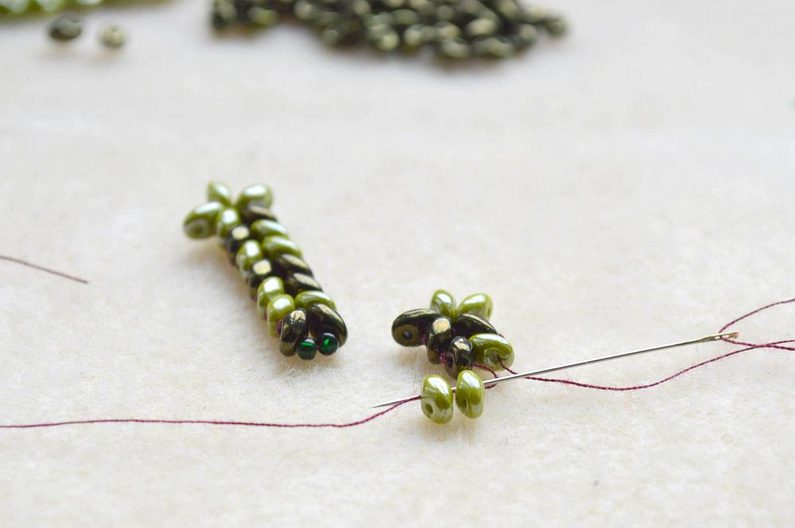 Vytvořím si „větvičky“. Pro tento účel jsem na podložce smíchala obě barvy Superdua, chtěla jsem vytvořit jakoby „melír“. Navleču si jehlu z obou stran návlekového materiálu. Začínám tak, že navleču 5 korálků namátkové barvy a 2 poslední provleču druhou stranou zpět. Utáhnu a poté se vrchní dírkou vrátím do středu větvičky. Na jednu stranu navleču 2 Superdua a druhou provleču zpět. Opět se vracím vrchní dírkou. Postup opakuji dle potřeby. Větvičku ukončím navlečením 2 korálků rokajlu o velikosti 10/0.