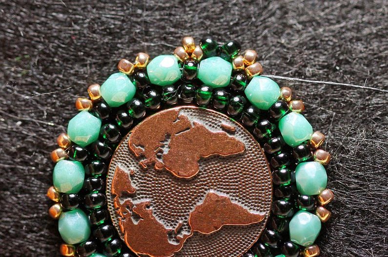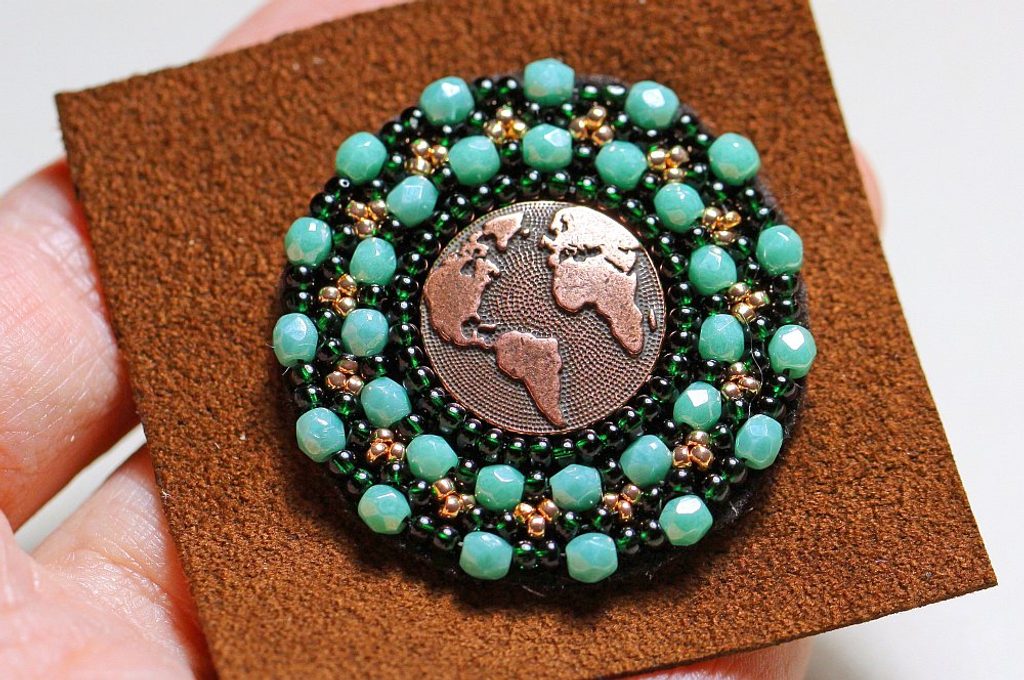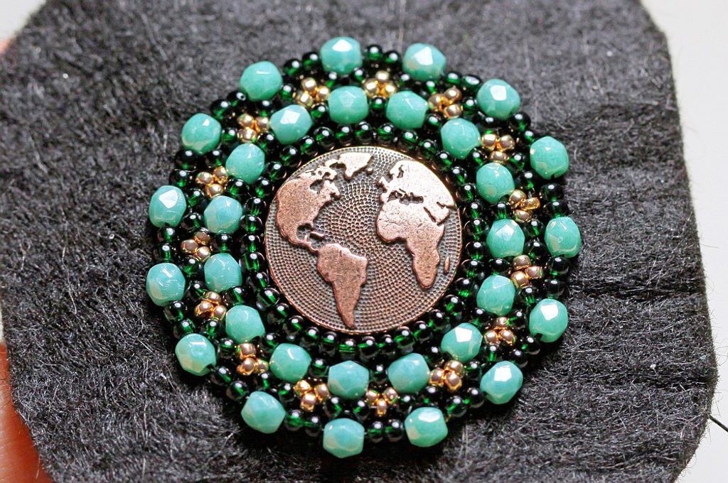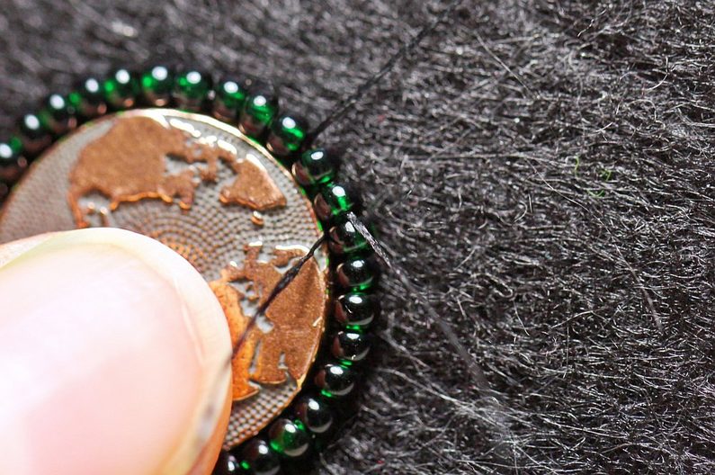 Začneme korálky PR10 obšívat knoflík. Navlékneme 3x PR10, našijeme podle obvodu knoflíku, jehlou se spodem vrátíme o dva korálky zpátky (vpíchneme jehlu mezi 1. a 2. korálek z rubu na líc) a jehlu znova protáhneme 2. a 3. korálkem. Dále navlékneme 2x PR10, jehlu zapíchneme a spodem se vrátíme o 3 korálky zpátky, které jehlou opět protáhneme. Celý obvod obšijeme tímto způsobem, neustále přidáváme dva korálky.