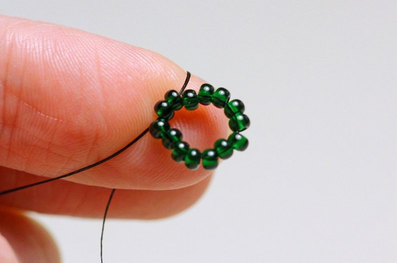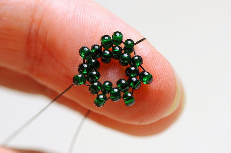 Protáhneme jehlu několika korálky, navlékneme 1x PR10 a jehlu protáhneme ob jeden korálek ze základového kroužku.