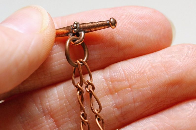 1 m řetízku si rozdělíme na dvě stejné části, délku si nastavte taky, aby Vám vyhovovala. Oba řetízky protáhneme šlupnou a konce zachytíme do spojovacího kroužku, kterým zároveň spojíme řetízky s americkým zapínáním.