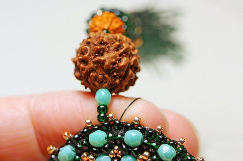 Vrátíme se zase nahoru. Jehlu vedeme středem a navlékneme 6mm korálek ze semínka Rudraksha, 1x PR10, další korálek ze semínka Rudraksha ve velikosti 12 mm, 1x BK3 a 2x PR10.