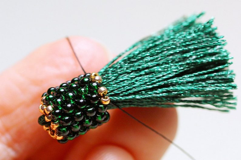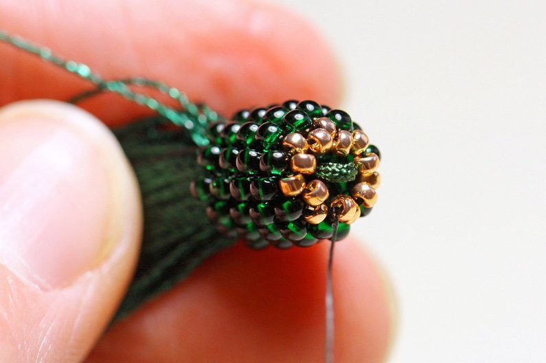 Ušijeme ještě 3 stejné řady z PR10 kolem vrcholku střapce. Další dvě řady pokračujeme stejným způsobem, ale vyměníme velikost korálků za TR15, aby se nám kaplík zužoval. Poslední řadu sedmi korálků následně protáhneme pouze nymem a utáhneme. To můžeme pro pevnější stažení opakovat.