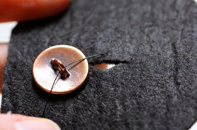 Vezmeme vyšívaný motiv a k jeho obšitému okraji přišijeme okrasnou část se střapcem. Dejte si pozor, abyste měli správně orientovanou mapu na knoflíku. :)