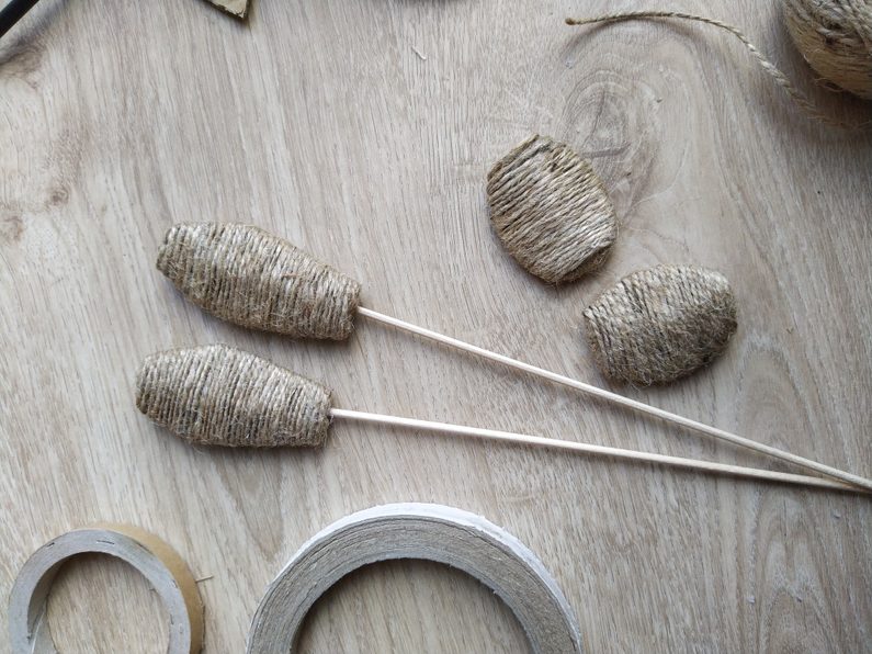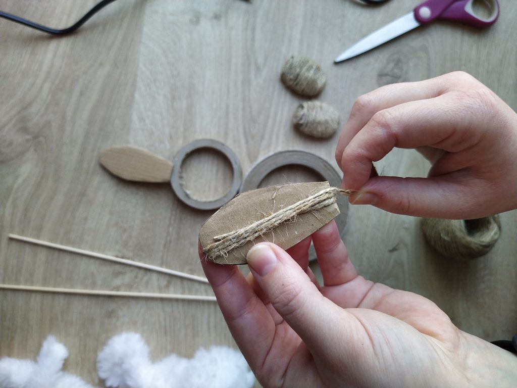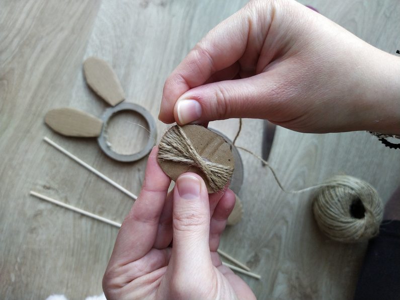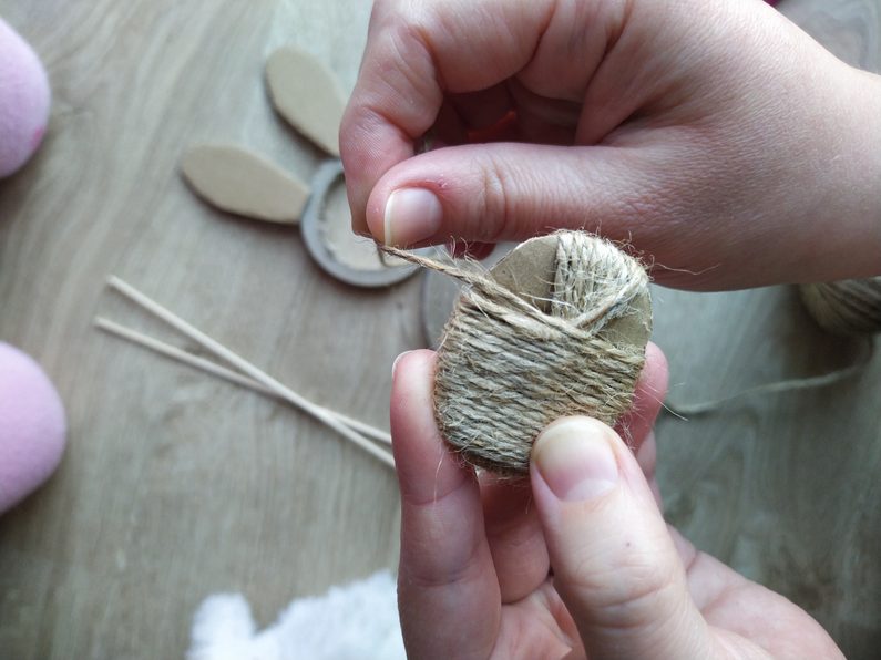 • Z kartonu si vystřihneme 2 kruhy (jeden menší o průměru cca 6 cm a jeden větší o průměru cca 14 cm), ouška a packy. Za pomocí tavné pistole uchytíme jutový provázek a omotáme celá ouška a packy. Do každého ouška navíc připevníme špejli a necháme z každého koukat cca 1,5 cm, zbytek ustřihneme.