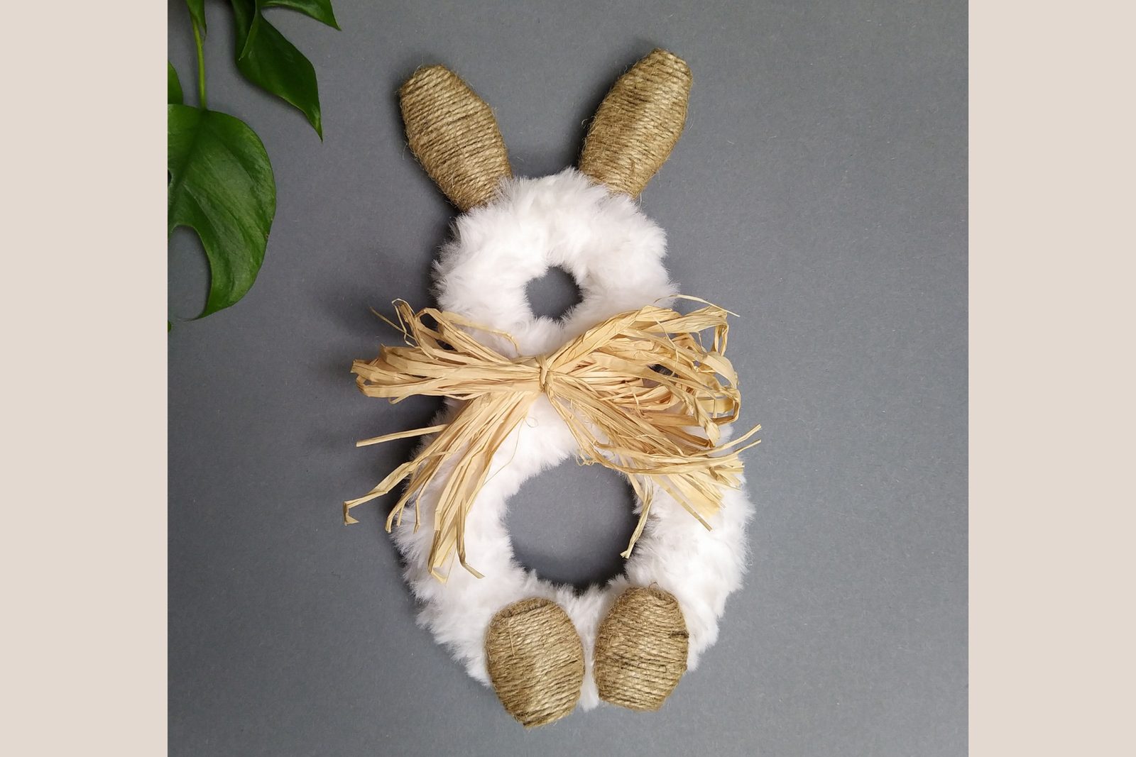 • Hotové omotané kruhy svážeme k sobě libovolným bílým provázkem. Přilepíme ouška, packy a přivážeme mašli z lýka.