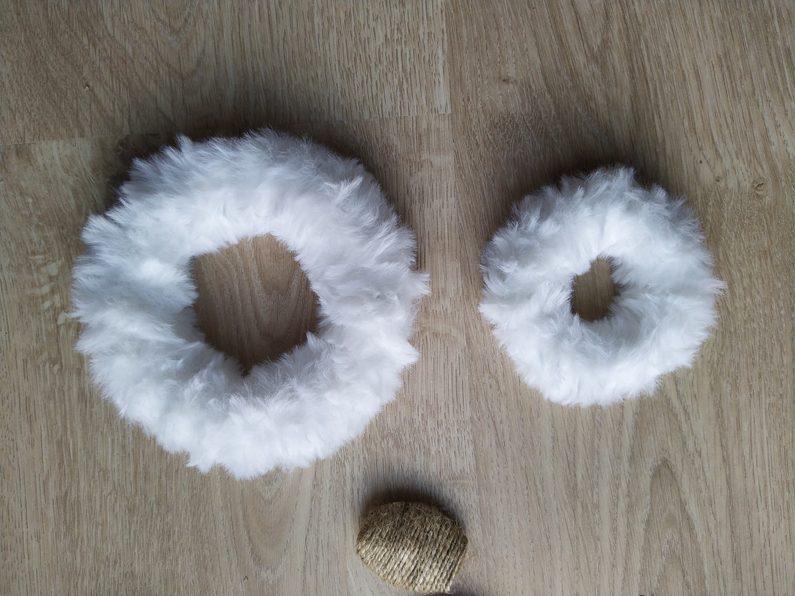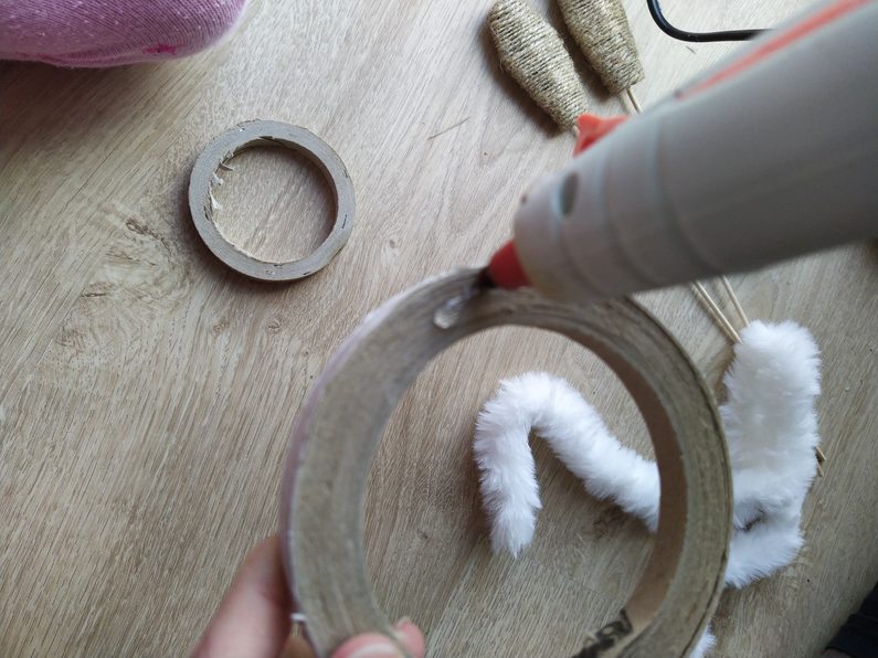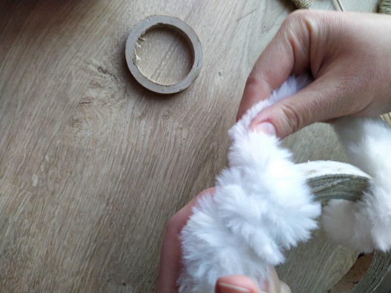 • Tavnou pistolí připevníme chlupatou přízi a celé kruhy omotáme.