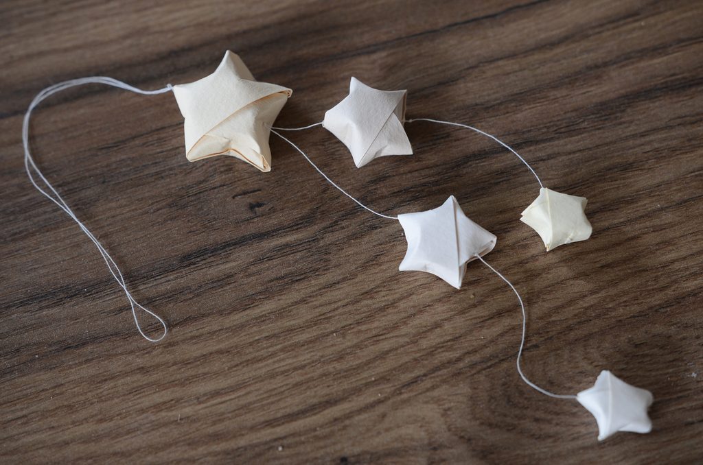 Nití propíchněte hvězdičky podle účelu, jaký mají plnit. V našem případě vznikla z hvězdiček ozdoba na dárek nebo stromeček.