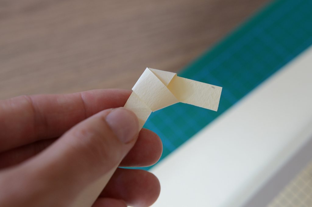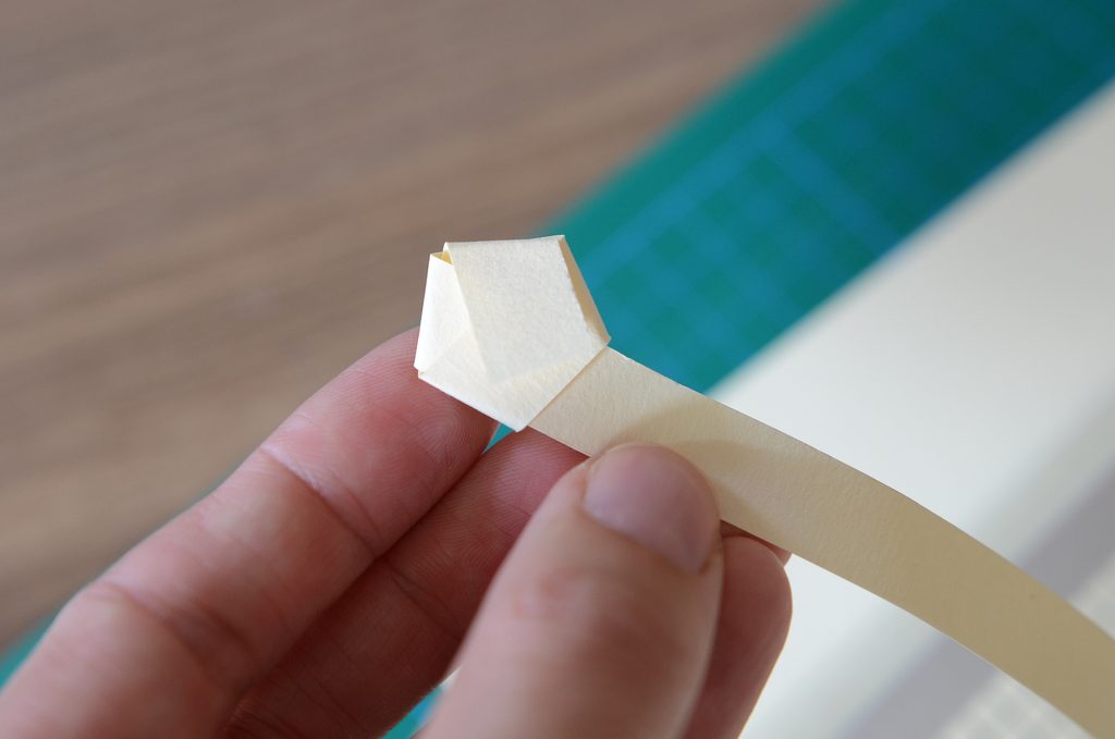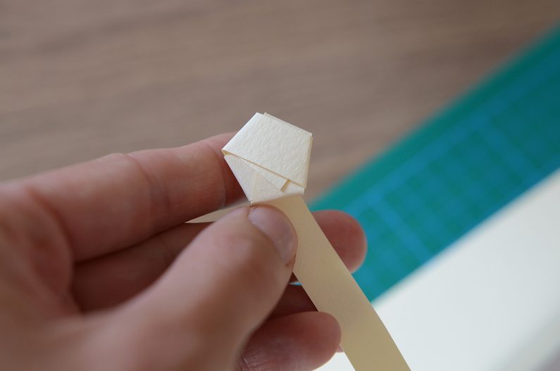 Kratší konec přehněte ke středu a poté vždy přes hranu ohýbejte zbytek proužku.