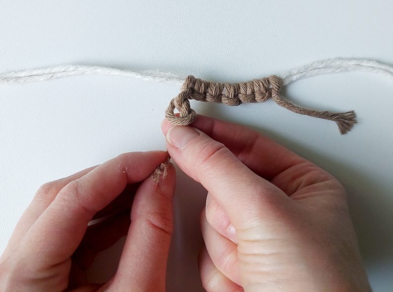 Ouško ke stínidlu upevníme jednoduchým uzlem a pokračujeme řetízkovým uzlem po celé délce stínidla. Na konci stínidla upevníme opět řetízkovým uzlem.