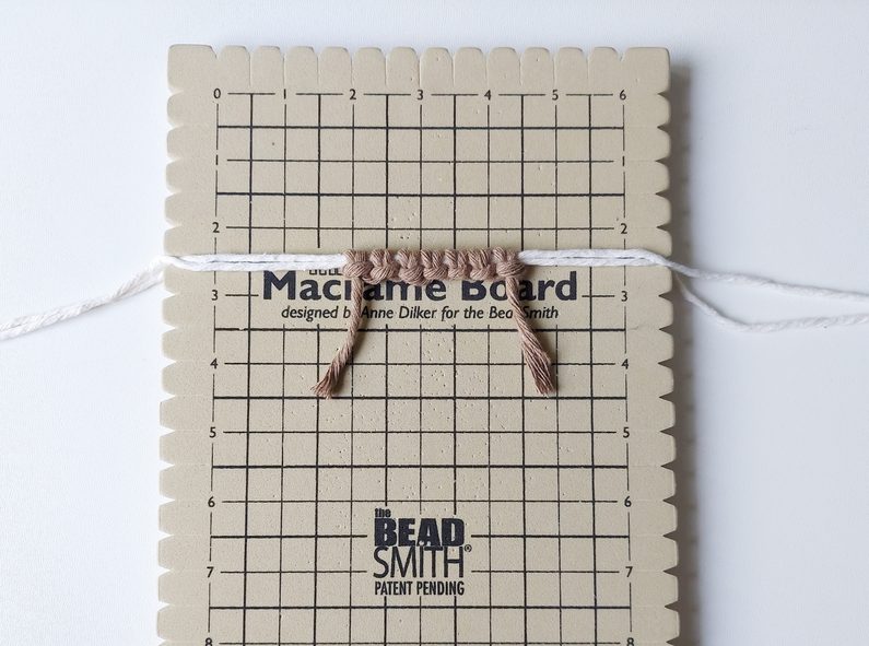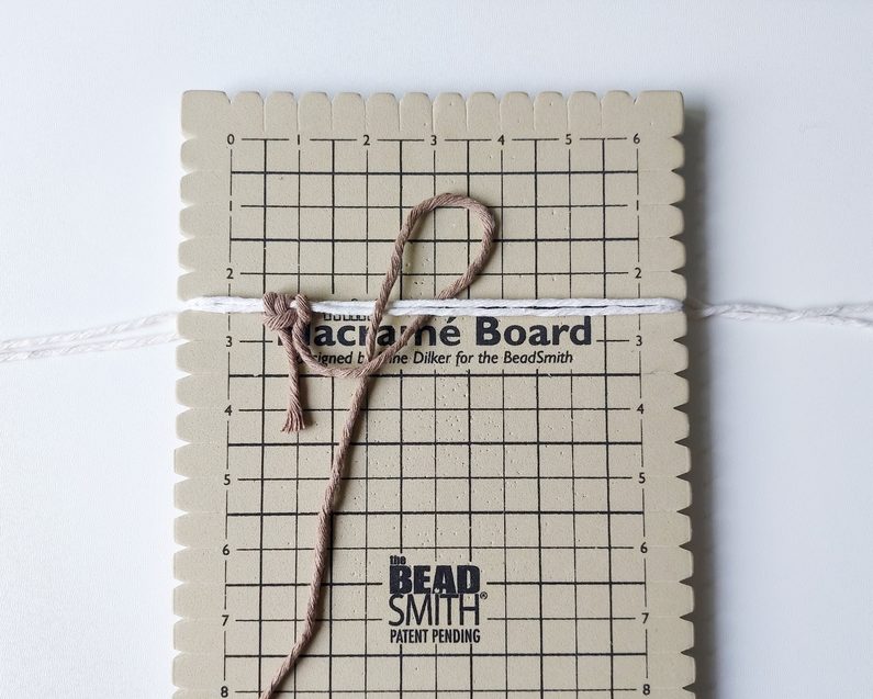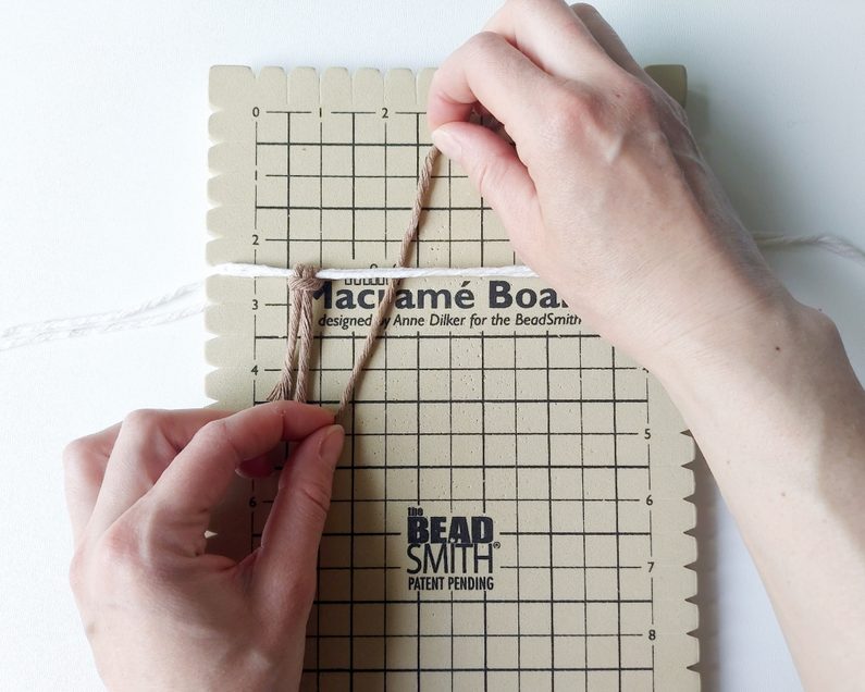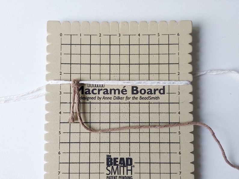 Připravíme si 2 kusy příze o délce 1 m jako základ na ouška. Uchytíme je do macramé podložky v cca polovině jejich délky.