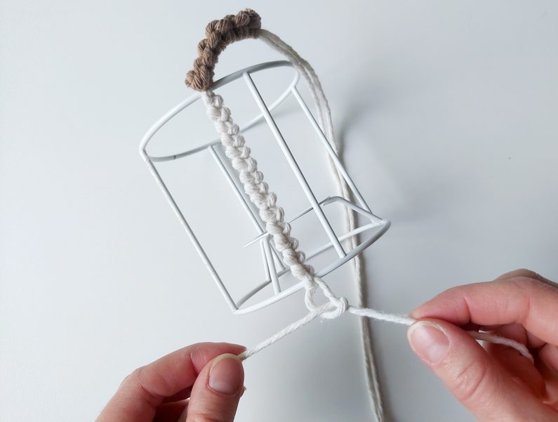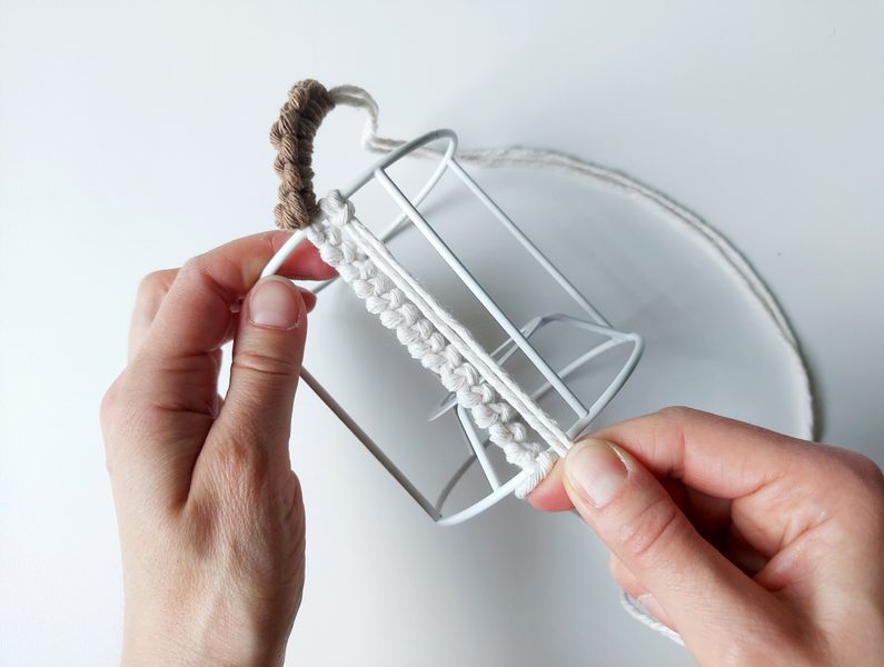 Mezi ouško vložíme 3 příze o délce 1 m za pomocí základního upevňvacího uzle. Dále pleteme řetízkový uzel. Stejným způsobem upleteme i druhé ouško a následně po celém obvodu stínidla opakujeme z přízí řetízkový uzel.