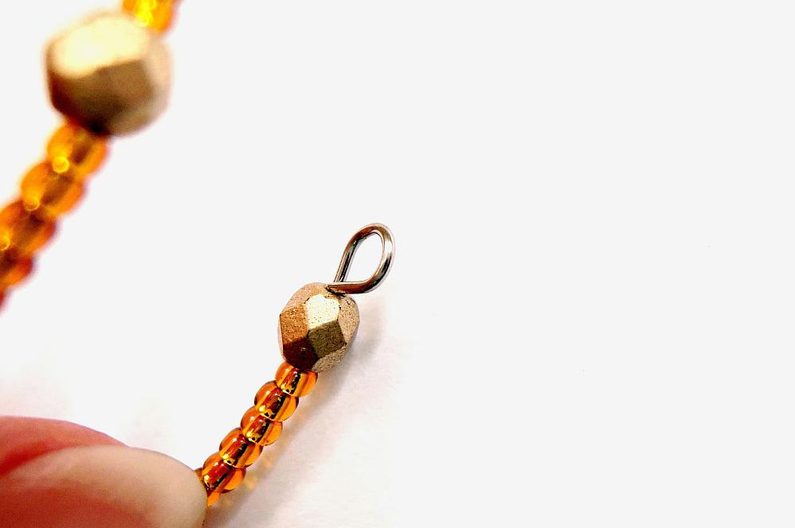 Kytičku navlékněte do středu náramku (Obr. 9) a pokračujte v navlékání BK4 a TR11 až do konce paměťového drátu tak, aby byl návlek ukončen BK4. Případně si paměťový drát upravte na potřebnou délku. Jeho konec zahněte ketlovacími kleštěmi směrem nahoru (Obr. 10) a náramek je hotov.