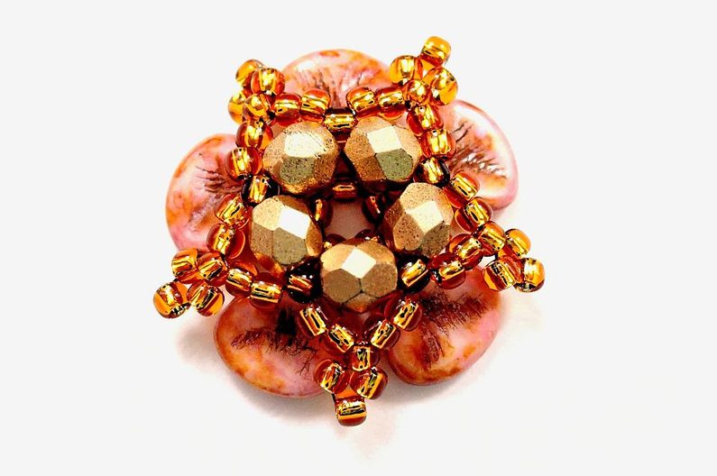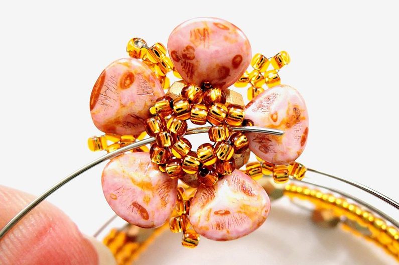 Nyní budete přidávat lístečky Rose petal – celkem 5 RP8. Navlékněte si 1 TR11, spodní (vypouklou) stranou navlečte RP8, opět nový TR11, vraťte se zpátky RP8, přidejte 1 TR11 a vraťte se vedlejším vystouplým TR11 z druhé řady základního kroužku. Důkladně utahujte a opakujte ještě čtyřikrát. Po poslední přidané skupince prošijeme zároveň první TR11 přidaný v této řadě, RP8 a TR11 nad ním. (Obr. 5)