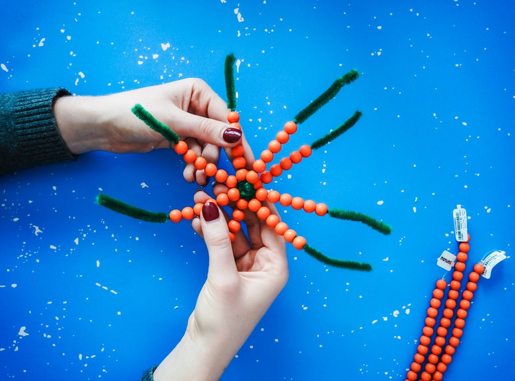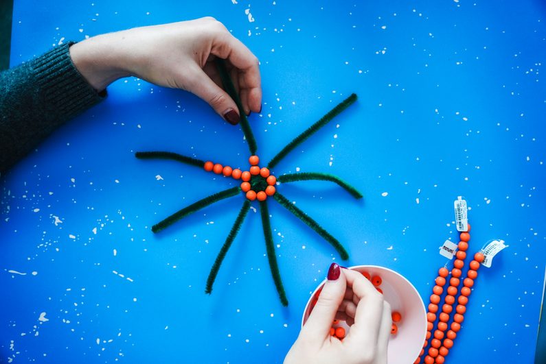• Na každý cíp pak navlékáme oranžové dřevěné korálky, v našem případě 6 kusů (záleží, jak chcete dýni velkou).