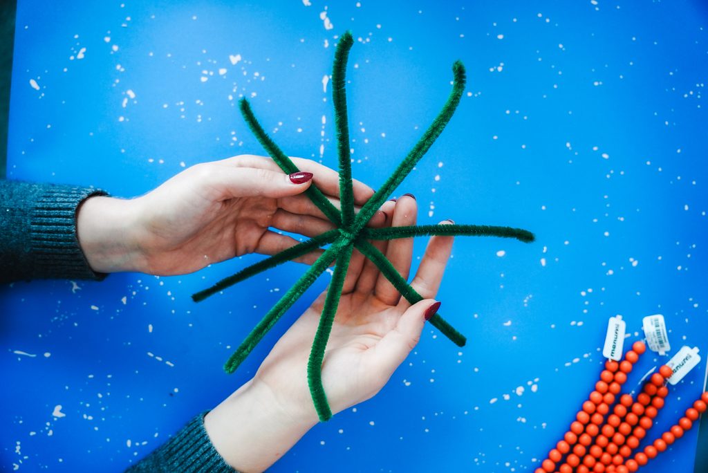 • Zelené žinylkové drátky si rozmístíme do kříže tak, abychom vytvořili osmicípou hvězdu. Uprostřed je přehneme přes sebe, aby se hvězda zafixovala.