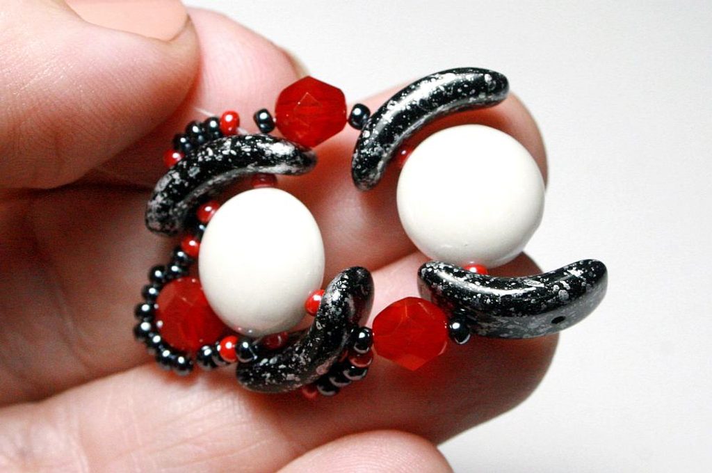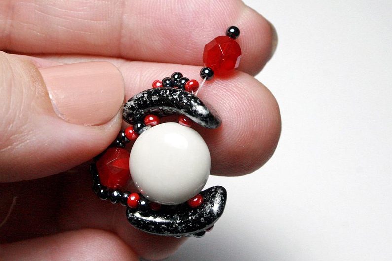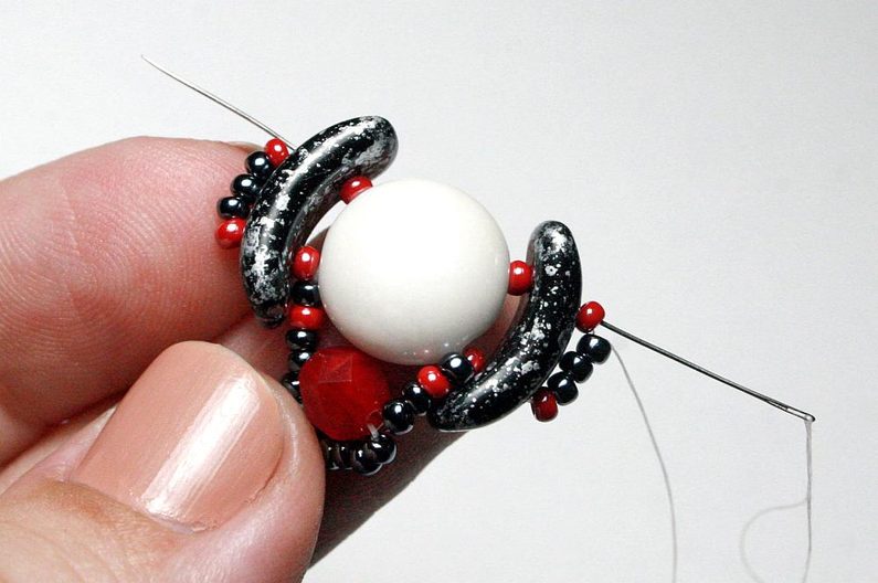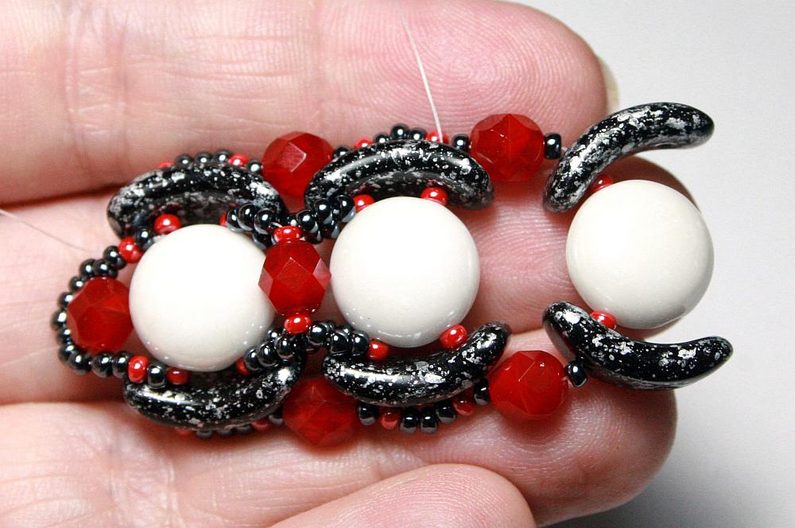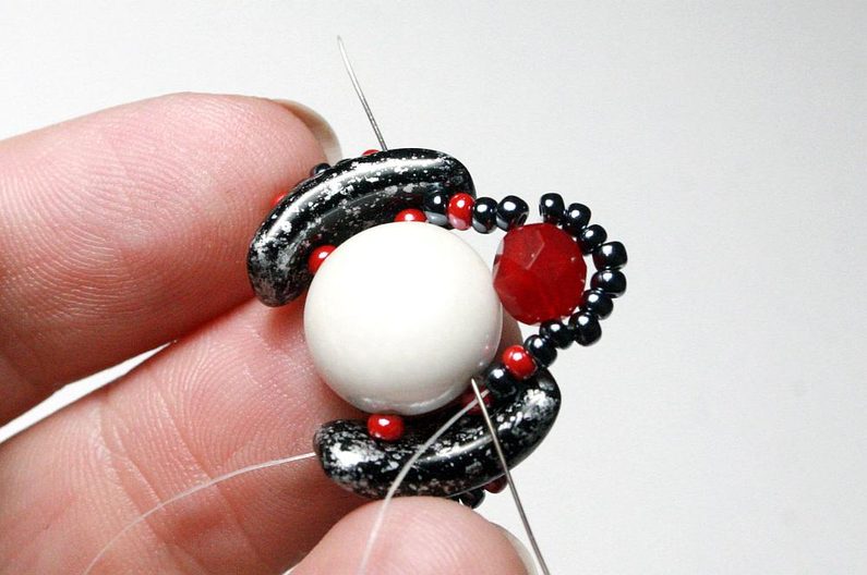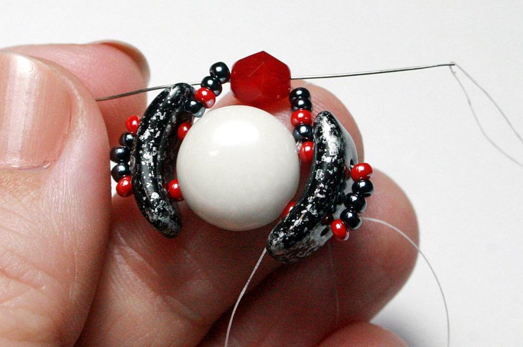 Dále navlékáme 1× PR10b, 1× BK6, 1× PR10b, Bow vypouklou straánou , 1× PR10a, PRECIOSA Candy, 1× PR10a, 1× PR10b, 1× BK6, 1× PR10b a projdemte přes Bow korálek na druhé straně od toho korálku, ze kterého vychází nit (Obr. 13–16).