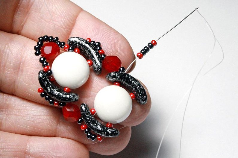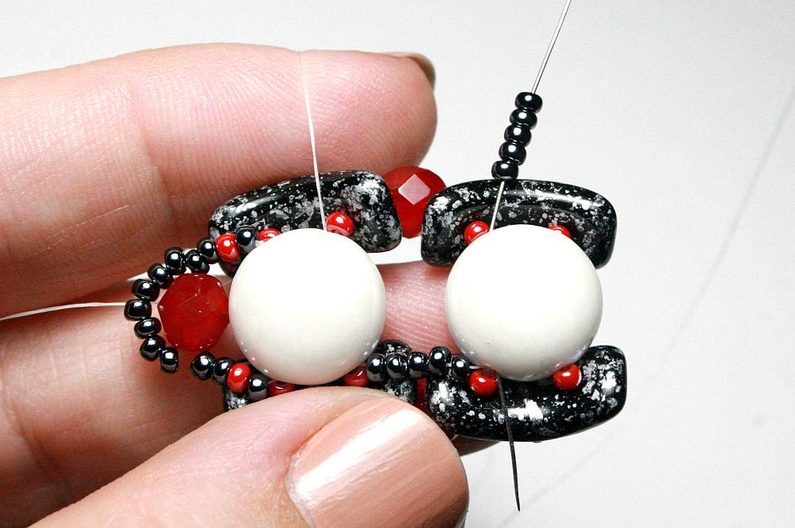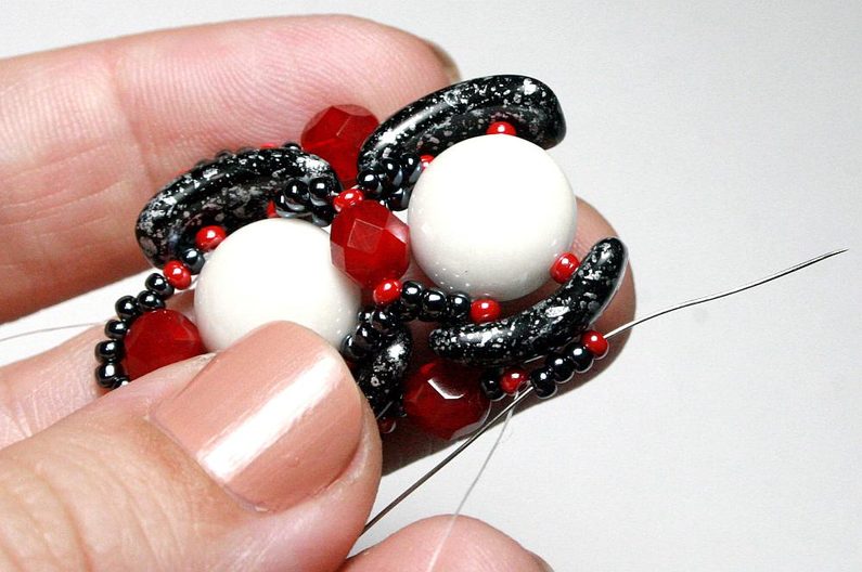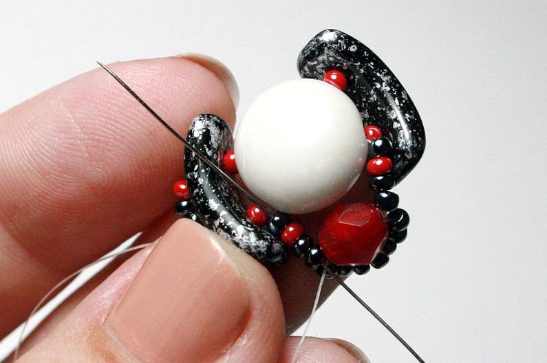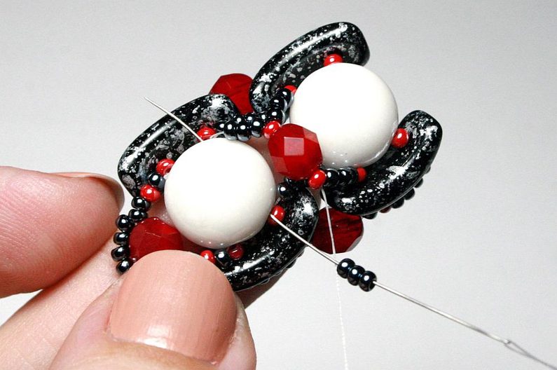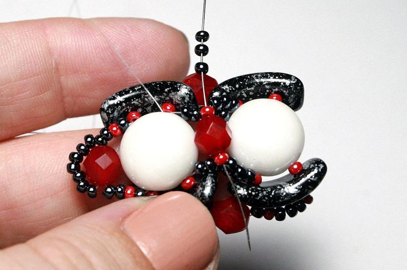 Skrz korálky se propracujte se na druhý konec výrobkupolotovaru, tak aby nit vycházela z vypouklé strany Bow (Obr. 9–12).