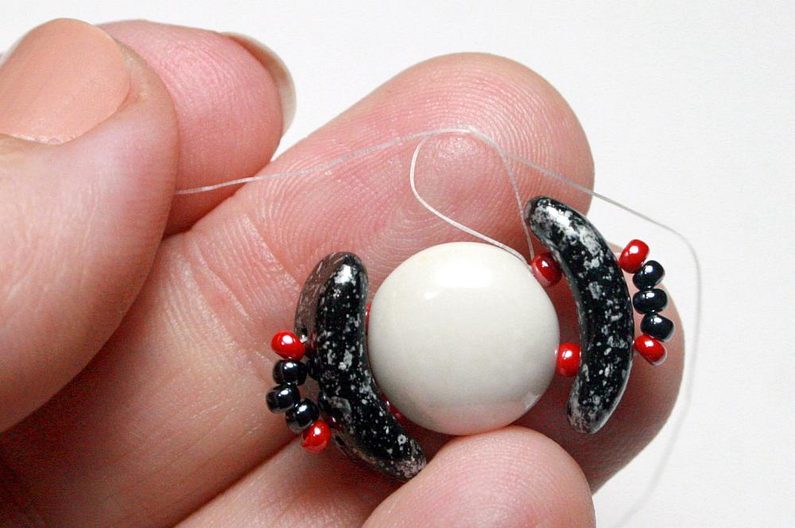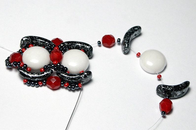Nechte kus Fireline délkou o délce cca 10 cm a dále navlékejte tak: PRECIOSA Candy, 1× PR10a, Bow vydutou stranou, 1× PR10a, 3x PR10b, 1× PR10a, projděte skrz druhou dírku Bow, 1× PR10a a projdete skrz druhou dírku CandyPRECIOSA Candy (Obr. 1) Dále 1× PR10a, druhý Bow vydutou stranou, 1× PR10a, 3× PR10b, 1× PR10a, projděte skrz druhou dírku Bow a nakonec 1× PR10a. Udělejte několik uzlíků (Obr. 2-–3).
