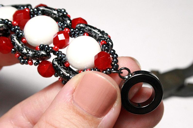 Na konci náramku zformujte očko pro přidání zapínání, jako jsme to dělali v krocích 2 a 3. Pomocí spojovacích kroužků připevněte zapínání a náramek máte hotový (Obr. 33–34).