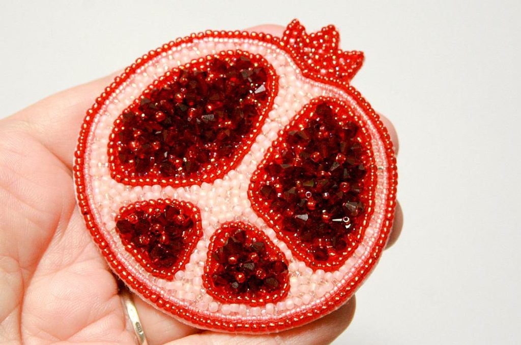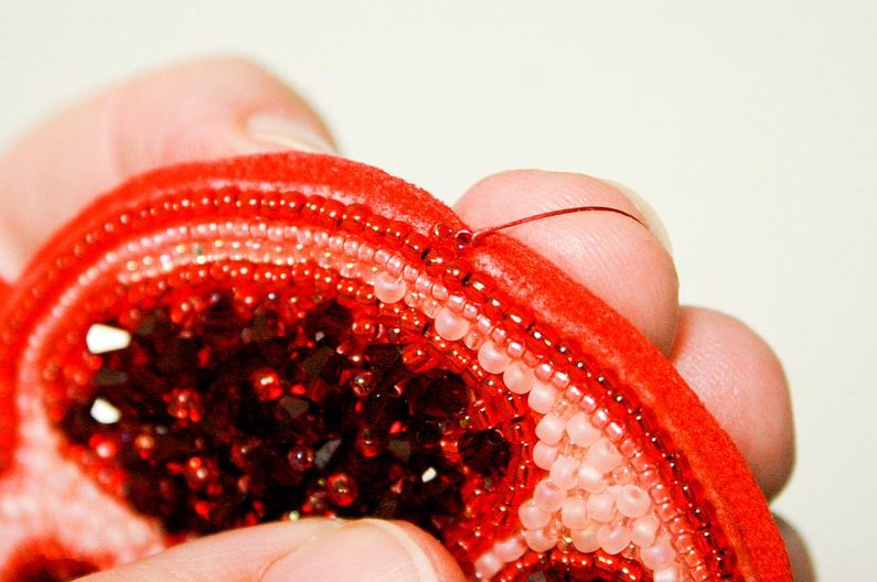 Vyšijeme horní část Granátového jablka korálky TR11a a mezery vyplníme korálky TR15c a TR15c (obr. 13).