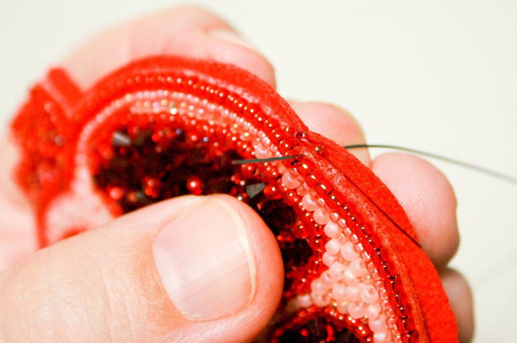 Nyní podšijeme. Jehla vychází na lícu, navlékneme 2x TR15c, jehlou propíchneme z rubu opět na líc (obr. 33) a protáhneme druhým korálkem a utáhneme (obr. 34 a 35). Navlékneme další TR15c, jehlou propíchneme z rubu na líc (obr. 36), utáhneme, protáhneme jehlu tím stejným korálem a opět utáhneme (obr. 37 a 38 v dalším kroku).