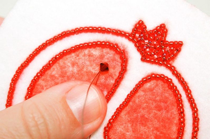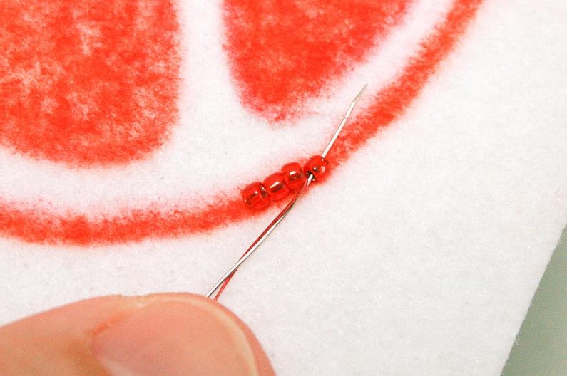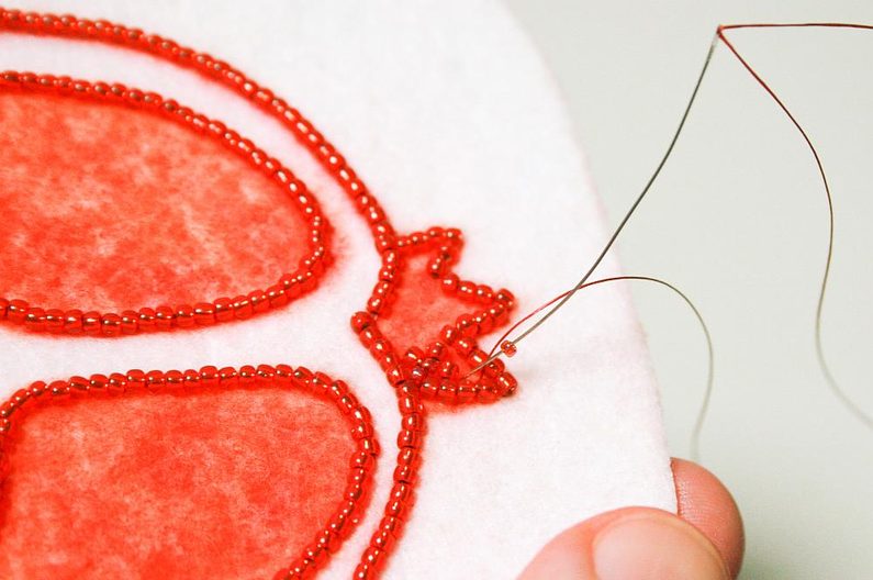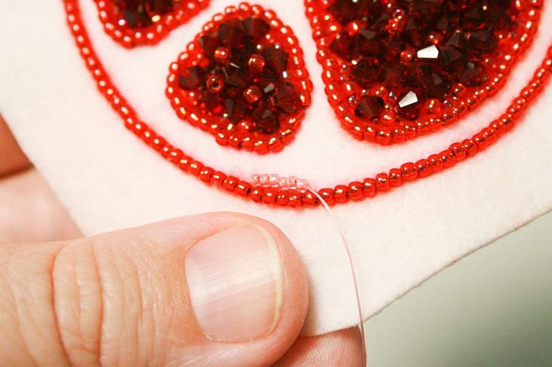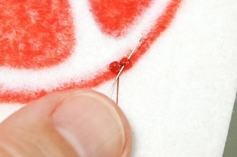 Navlékáme po 2x TR11a korálky, přišijeme do podkladu, utáhneme a vytáhneme jehlu mezi korálky, po směru vyšívání pak projdeme skrz druhý korálek(obr. 9 až 11). Postup opakujeme dokud nevyšijeme celý obrys (obr. 12).