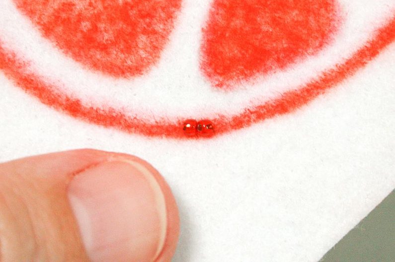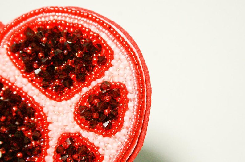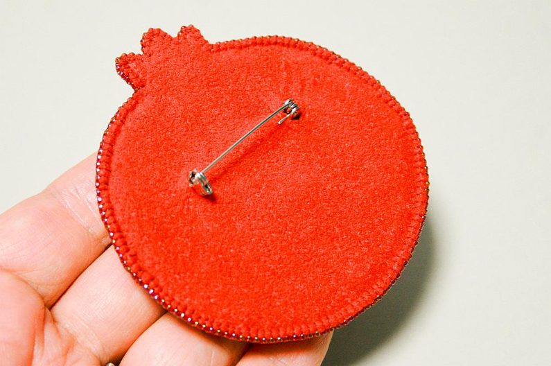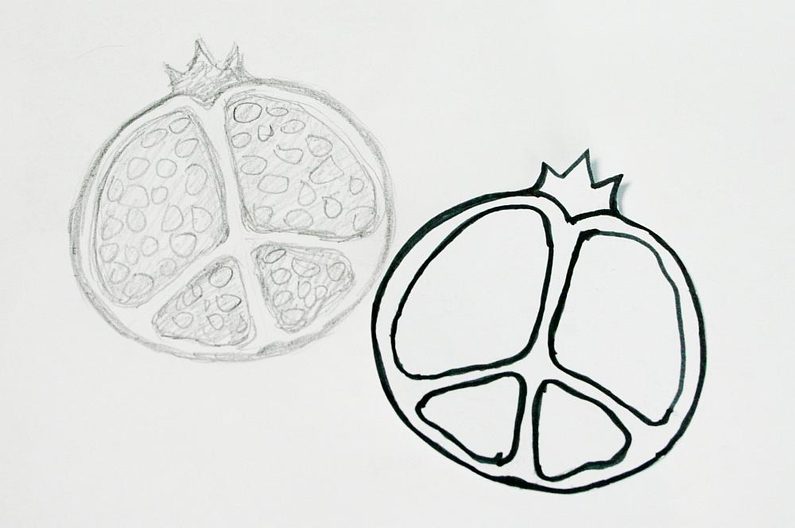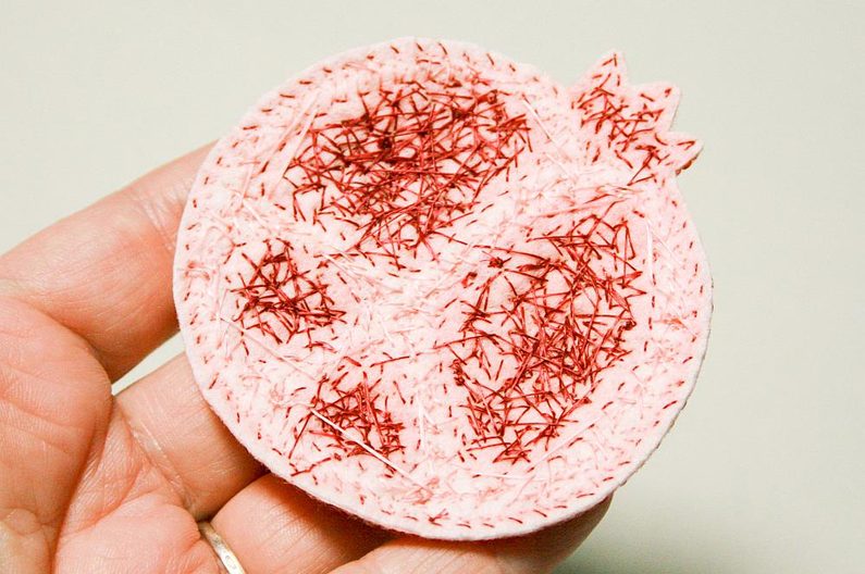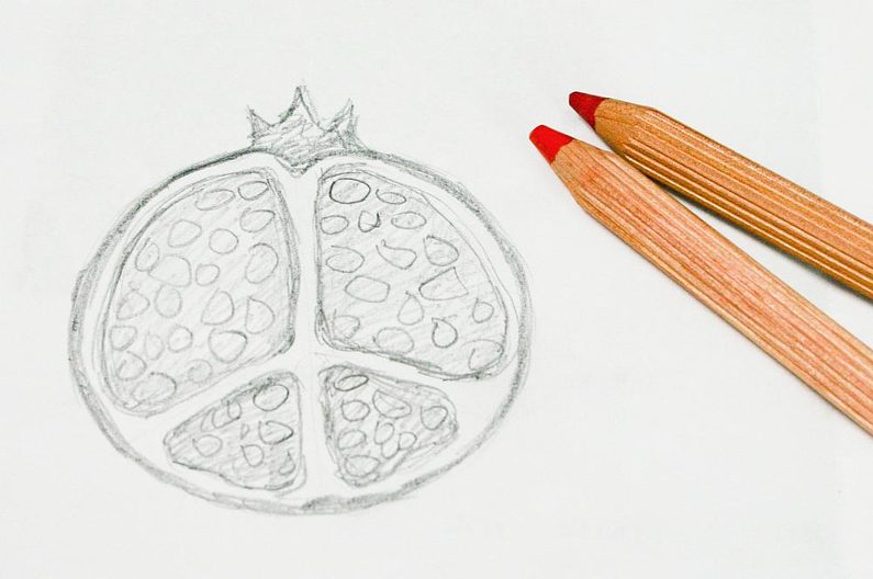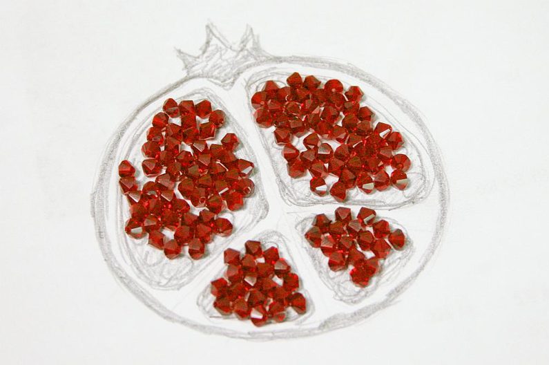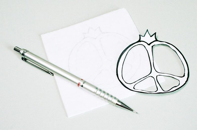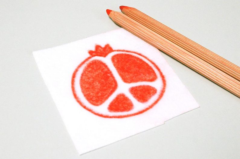 Najdeme si nějakou inspiraci na netu a nakreslíme si návrh granátového jablka na papír. Rozměr mého je kolem 7 cm (obr. 1-2). Taky budeme potřebovat červenou a malinovou pastelku pro vybarvení vyšívací podložky (obr. 3). Rozdělíme ohňovky na 4 skupiny (obr. 4). Kontury našeho návrhu přemalujeme na papír a vystřihneme (obr. 5).