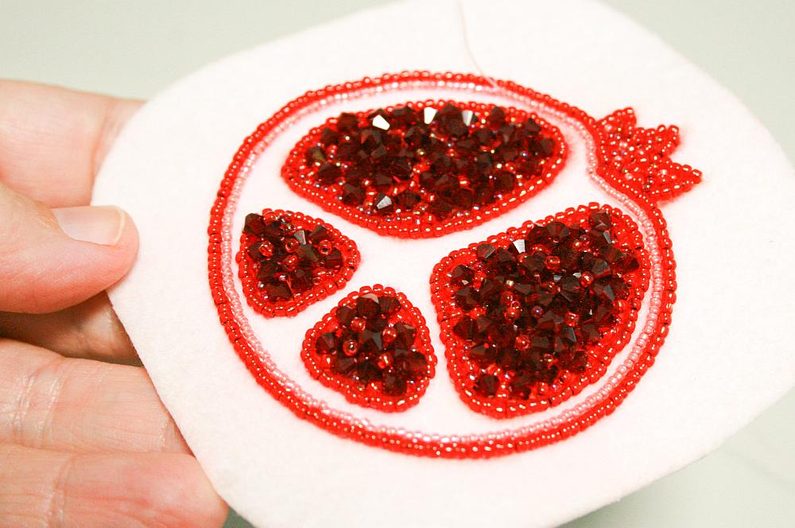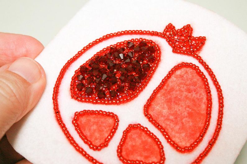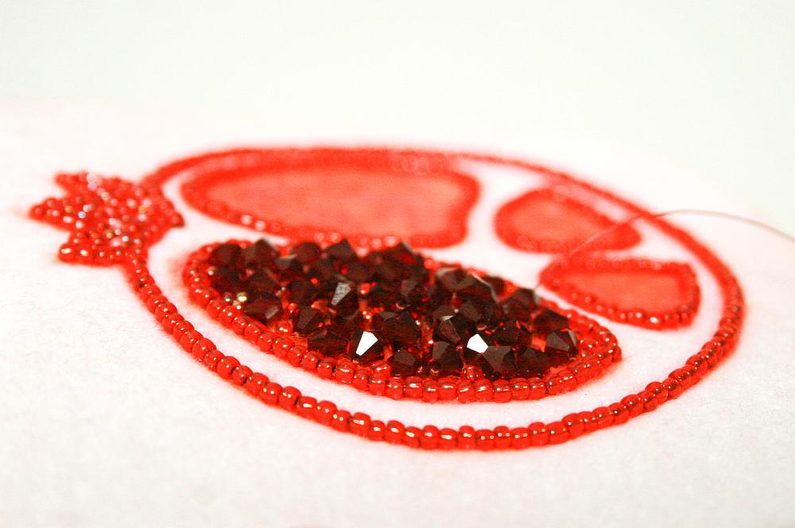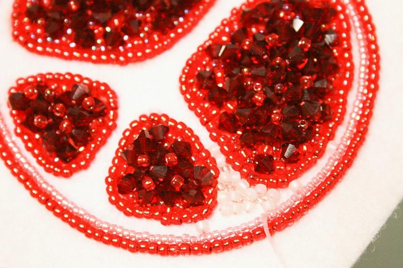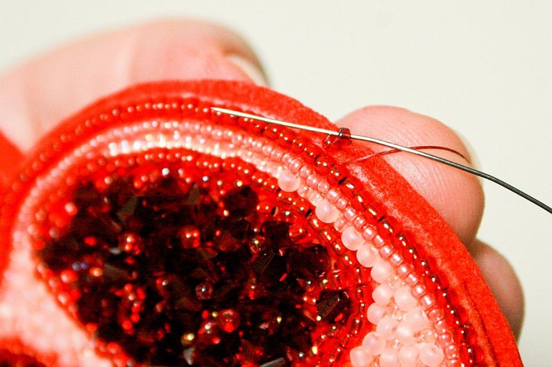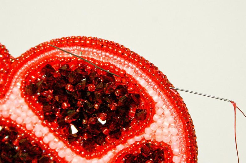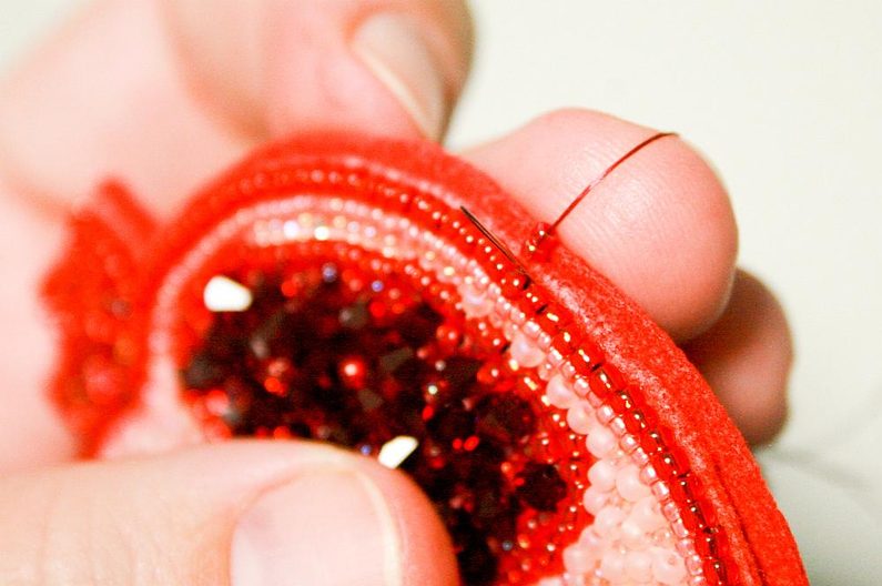 V dalším kroku náhodně pošijeme červenou část výšivky ohňovkami (obr.14 a 15), mezery vyplníme korálky TR11a a TR15c (obr. 16), využijeme všechny korálky které jsme oddělili na začátku, tak abychom docílili plastického efektu (obr. 17 a 18).