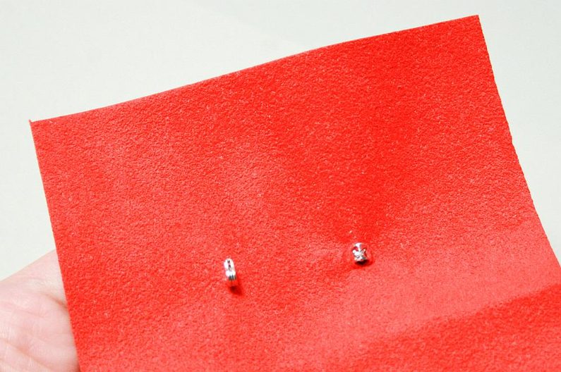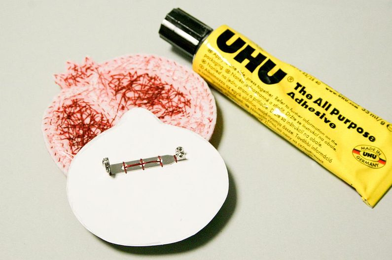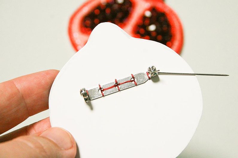 Z brožového můstku vytáhněte jehlu, přiložte na zadní stranu brože kousek semišového podkladu a vystřihněte do ní dírky, aby se dala na brožový můstek nasadit. (obr. 31). Poté podklad přilepíme a obstřihněte kolem hotové výšivky o cca 1 mm větší z každé strany (obr. 32).
