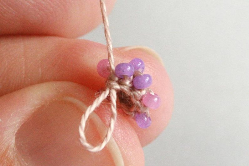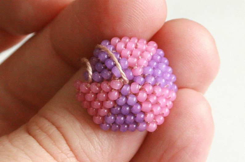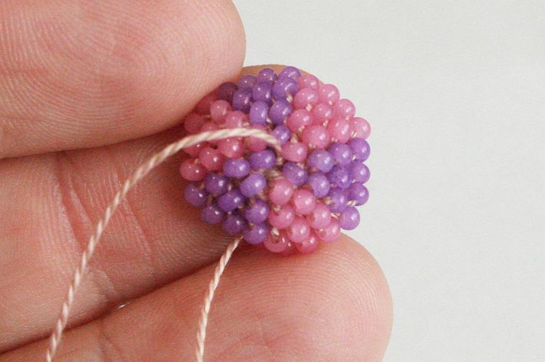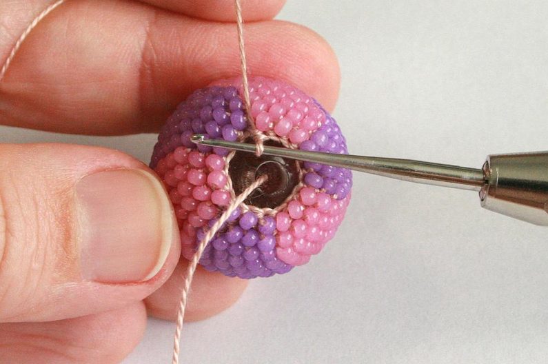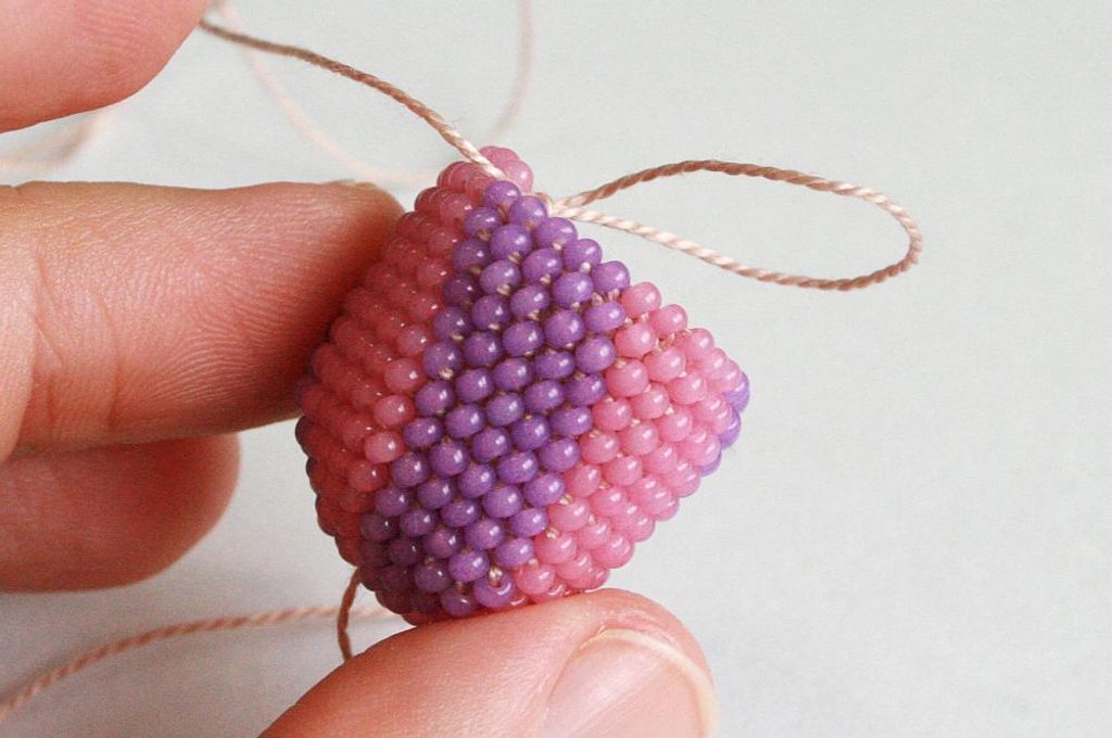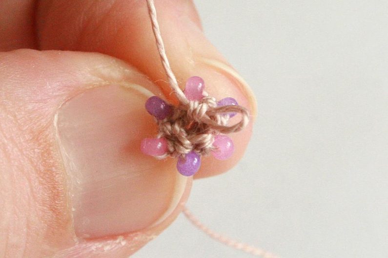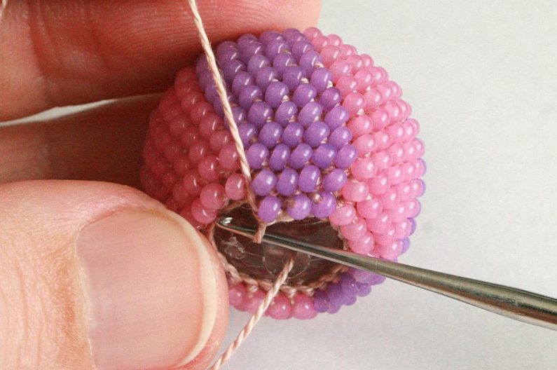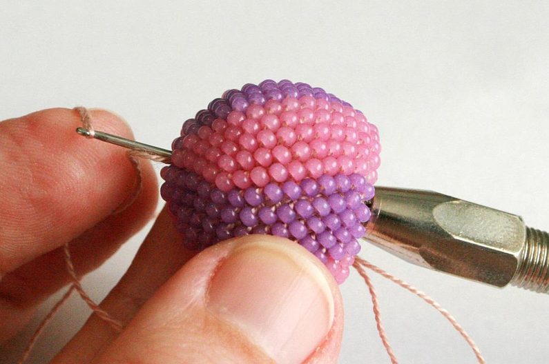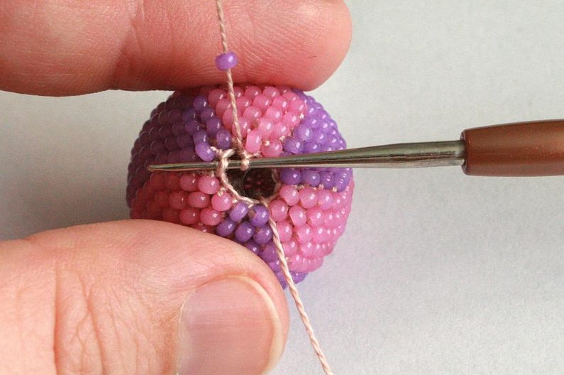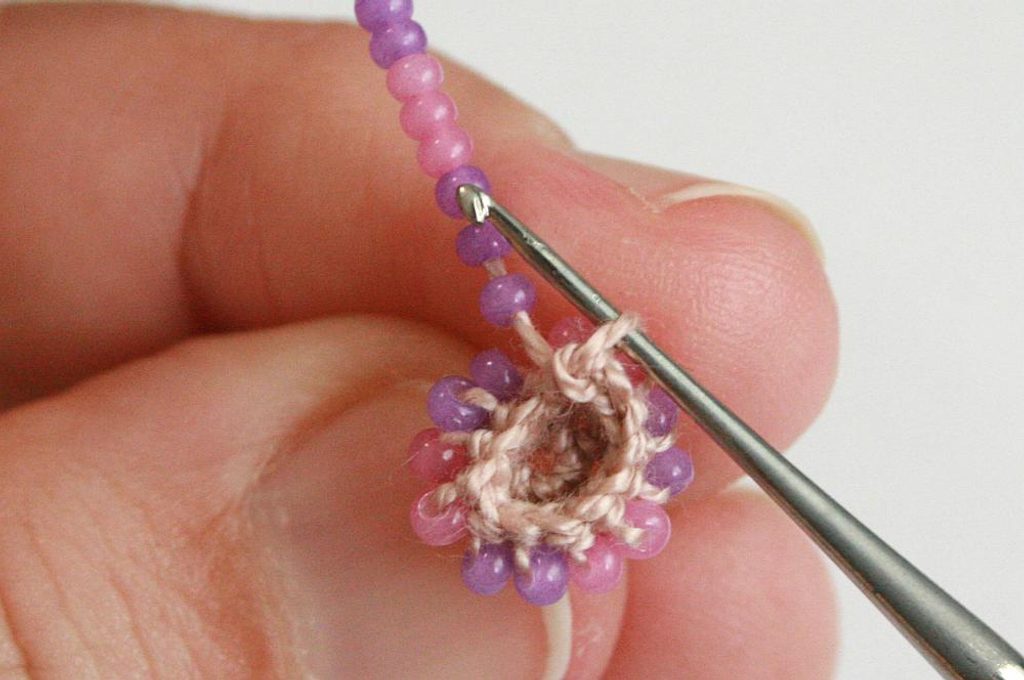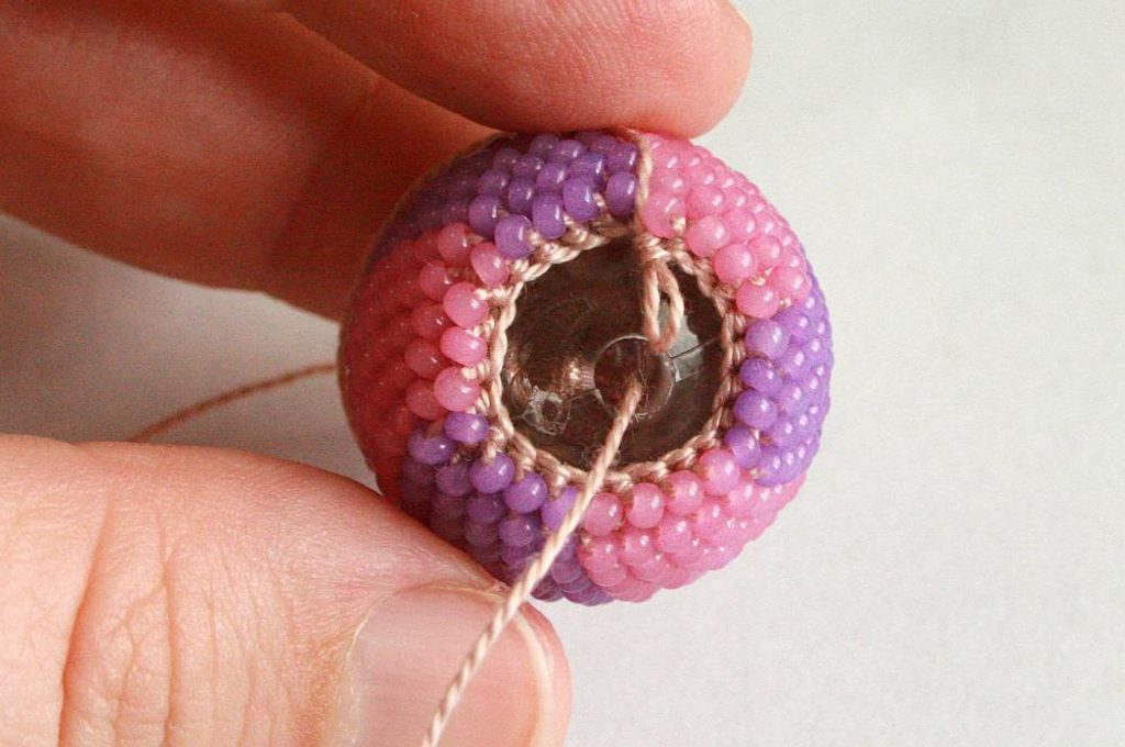 Po tom co ubereme půlku řady (obr. 34), vložíme do háčkované mističky kuličku (obr. 35) a protáhneme skrz ni konec příze, který nám zůstal na začátku – tím zajistíme, abychom neztratily dírku v korálku (obr. 36 - 37).