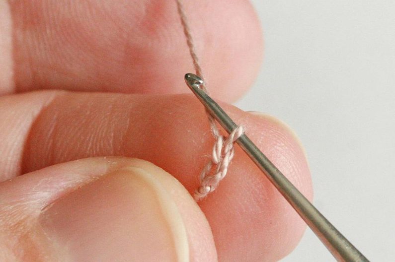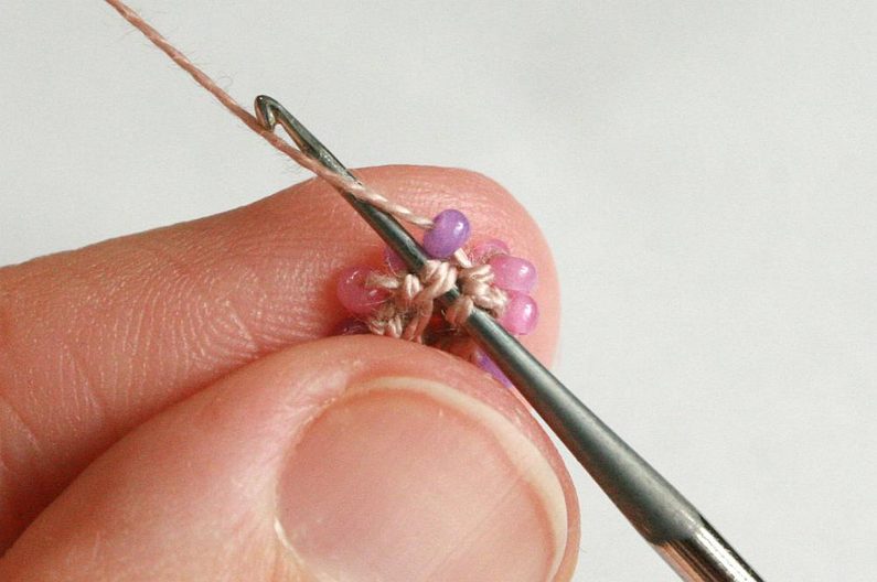 Takže přeskočíme první korálek v čipu a píchneme háček hned do druhého sloupku (obr. 31) a uháčkujeme 4 krátké sloupky do zbylých 4 oček v čipu(obr. 32–33).