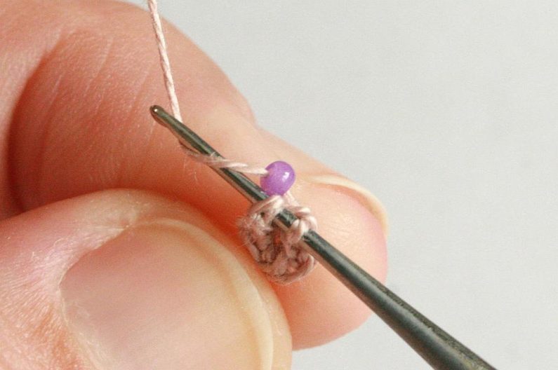 Dále pokračujeme druhou řadu: píchneme pod nit (obr. 14), seshora přisuneme jeden korálek, zezadu háčkem podebereme přízi a protáhneme prvním očkem — na háčku dvě očka (obr. 15–16). Dále opět podebereme přízi a protáhneme dvěma očky naráz (sloupek; obr. 17). Stejně přidáme další korálek do toho samého oka (takže vlastně máme 2 sloupky v jednom oku; obr. 18). Udělejte takovým způsobem celou řadu.