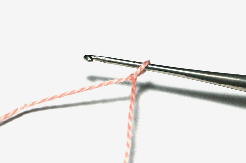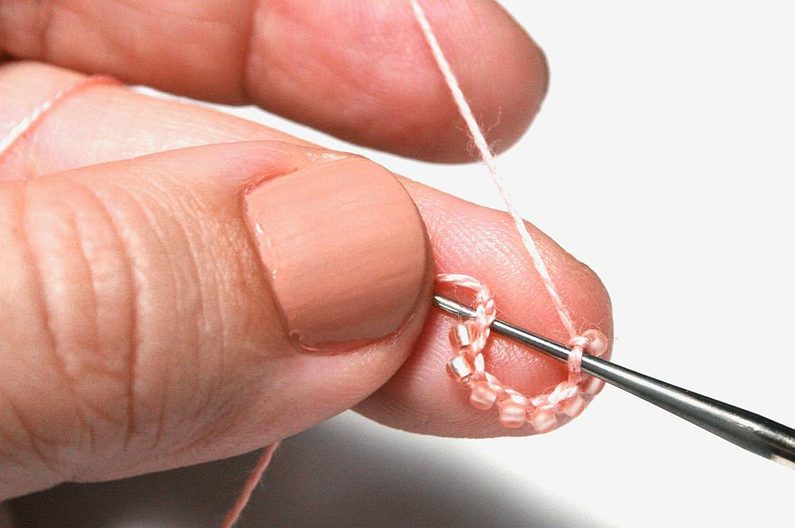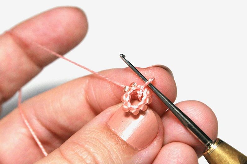 Stejně udělejte ještě 7 řetízkových ok s korálky (Obr. 7). Dále spojte řetízek do kroužku tak, že provléknete háček prvním základním očkem (Obr. 8) a protáhnete přízi oběma oky najednou (Obr. 9).