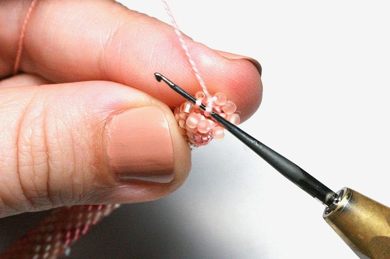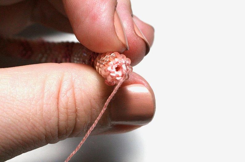 Přidáme perličky do druhé řady a pak háčkujeme pevná oka s perličkami spirálou kolem dokola (Obr. 12). Pokud mají všechny perličky ve všech řadách otočenou dírku po směru háčkování (nahoru), postupovali jste správně (Obr. 13).