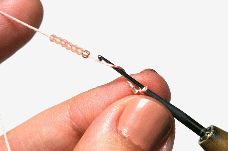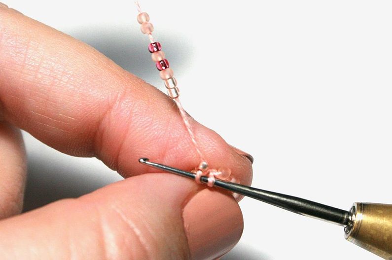 Pak háček zapíchněte do očka zleva od první perličky (Obr. 10). Otočte perličku dospodu doprava, posuňte co nejblíže další perličku, háčkem zachyťte přízi a uháčkujte pevné očko (protáhněte přízi oběma oky najednou; Obr. 11).