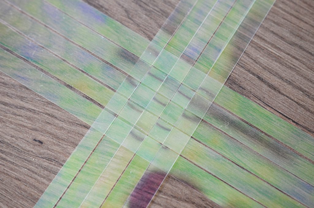 Pokračujte provlékáním pásků a střídejte vždy úrovně provlékání tak, aby vám na závěr vznikla uprostřed celistvá mřížka složená z celkem deseti pásků.