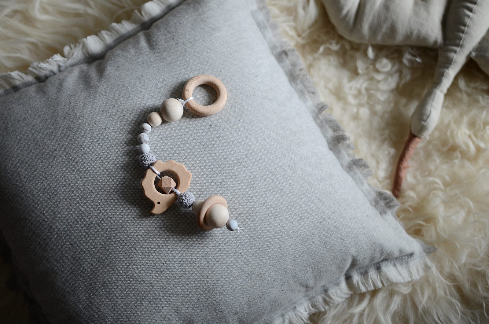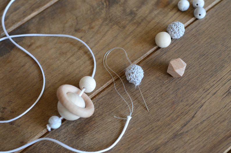 • Následně udělejte také druhý uzlík na kousátku a opět s pomocí jehly a nitě navlékněte druhý háčkovaný korálek. Pokračujte navléknutím 3 malých silikonových korálků – 1 malého dřevěného korálku 16 mm – 1 velkého dřevěného korálku 25 mm.