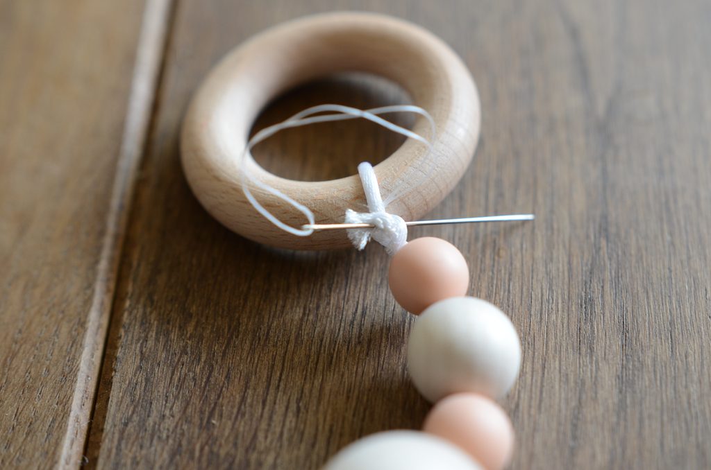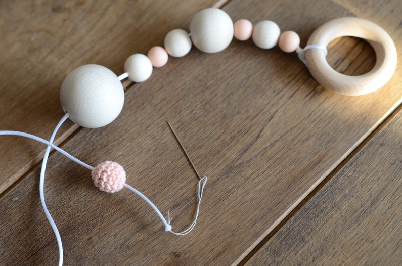 Konec šňůrky pomocí jehly protáhněte nazpět háčkovaným korálkem a utáhněte. Na konci hračky na hrazdičku tak vznikne malé poutko.