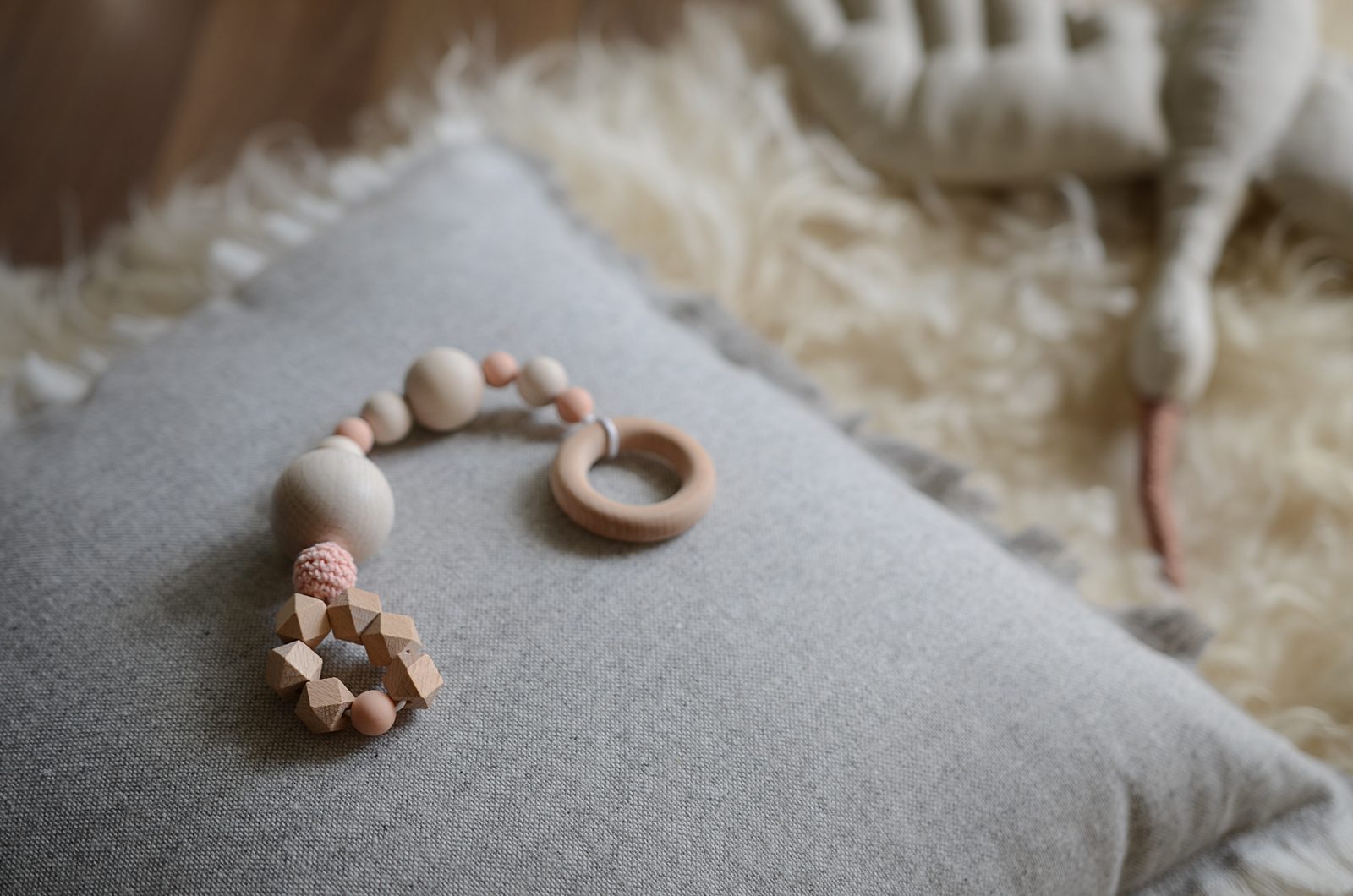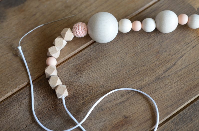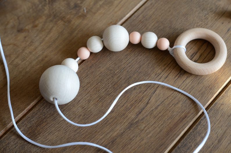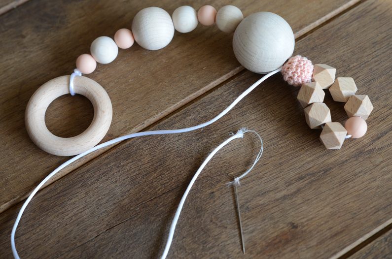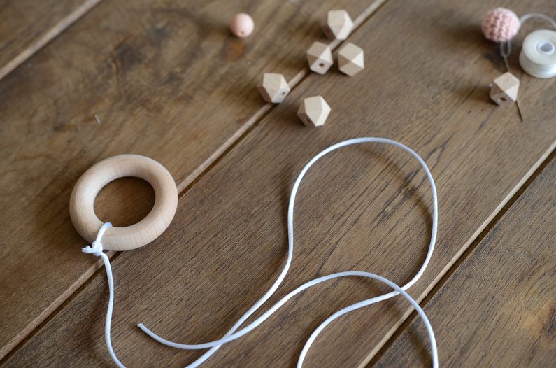 Ustřihněte si přibližně 40 centimetrů saténové šňůrky a na její konec přivažte kousací kroužek.