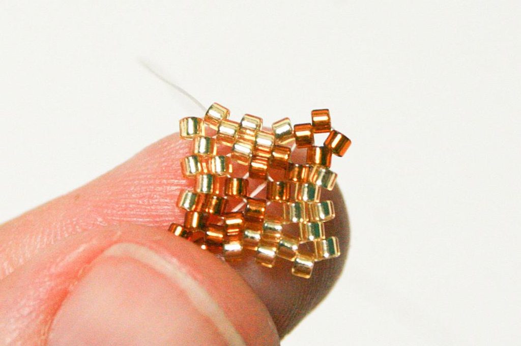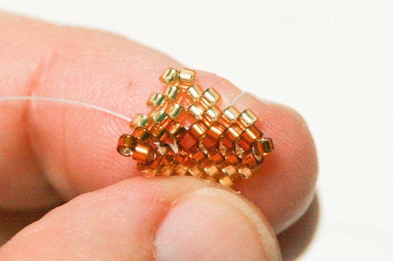 Projděte skrze první z korálků, co je na dalším rohu a zároveň do korálku, který je nad ním – tím uděláte přechod na další (čtvrtou) řadu (obr. 25 – 28).