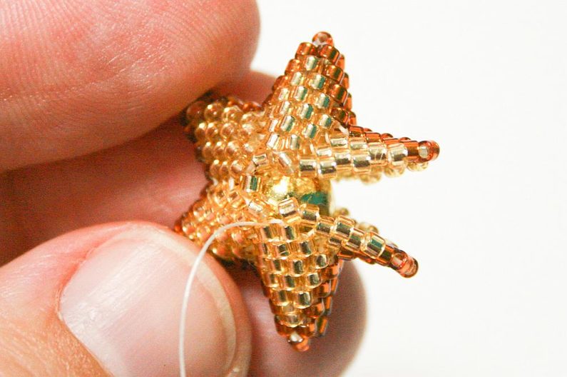 Až hvězdu sešijete, projděte skrz korálky do středu a sešijte středové korálky k sobě – tím hvězdu ukončíte (obr. 85 – 86).