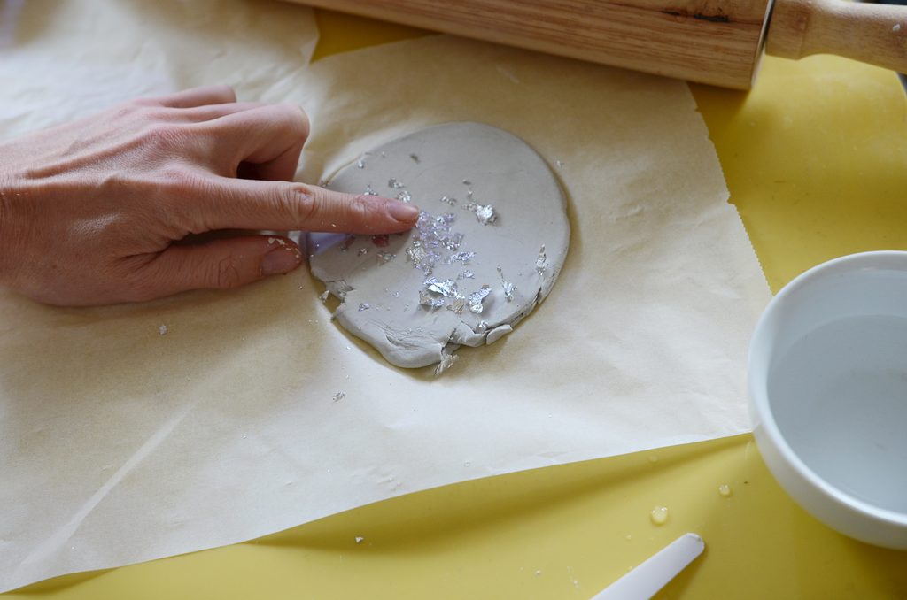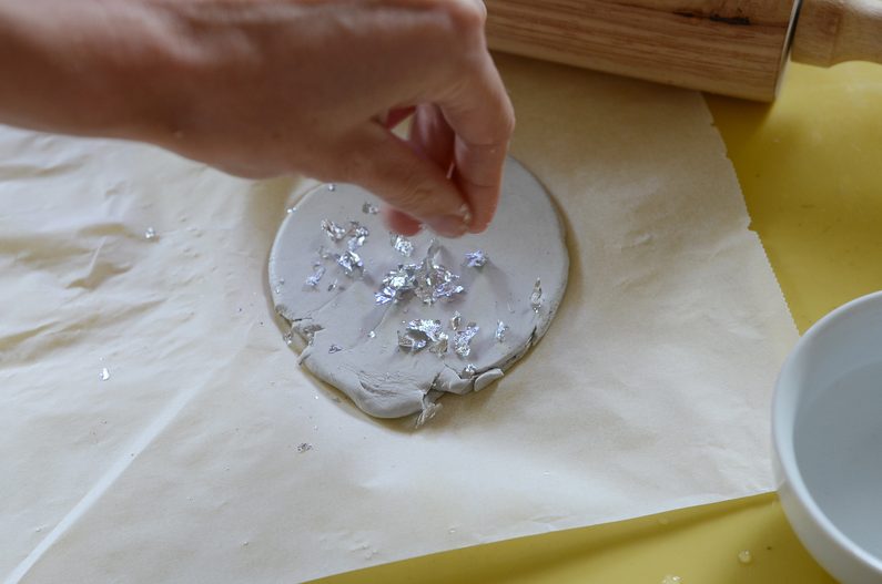 • Nasypejte trochu metalických plátků a jemně je prstem zahlaďte do hmoty, aby se dobře přichytily.