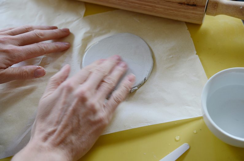 • Hmotu rozválejte na přibližně 5 mm silný plát. Aby se vám nepřilepovala a hotový výrobek se dal dobře přemisťovat, dejte mezi ní a podložku kus pečícího papíru.