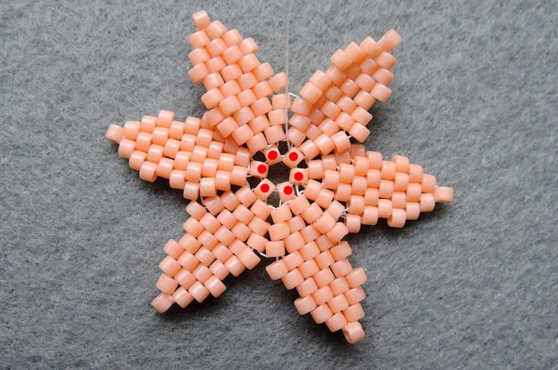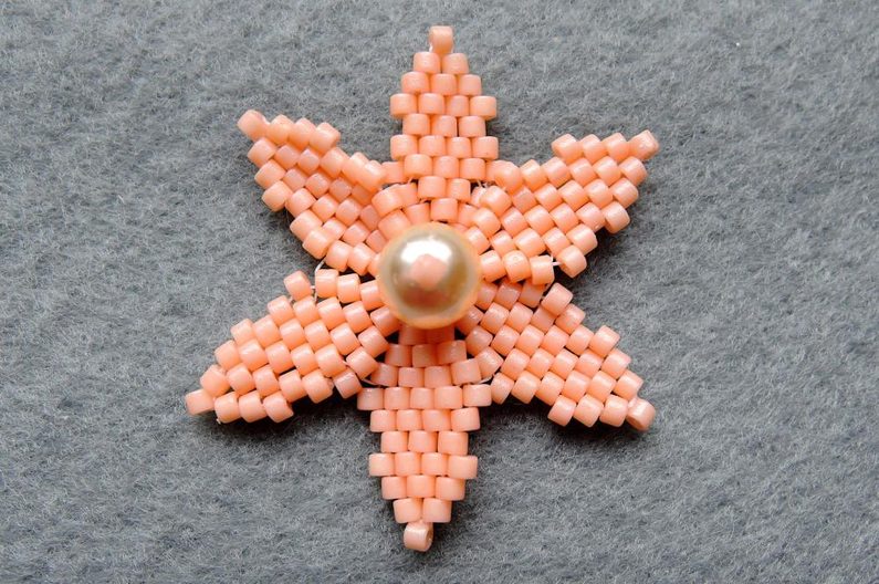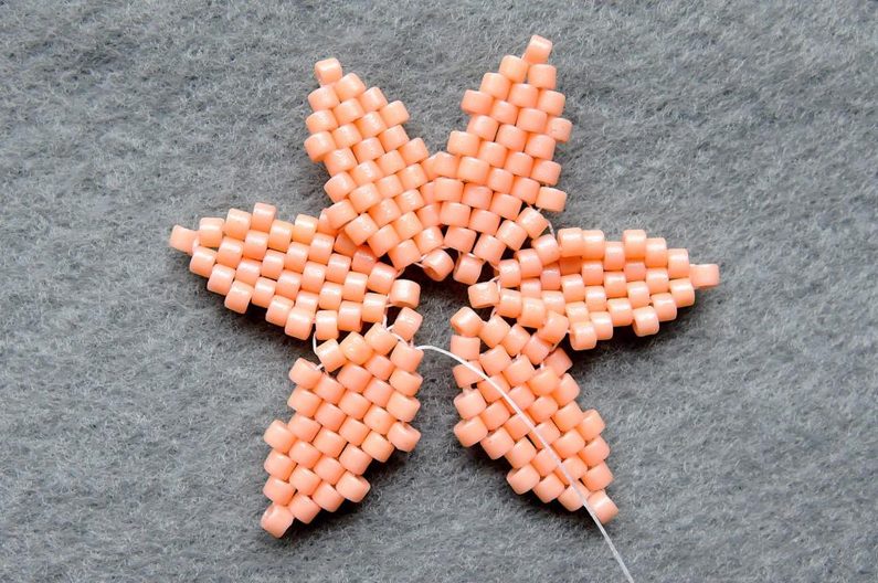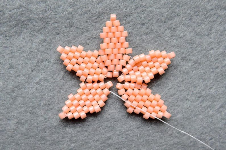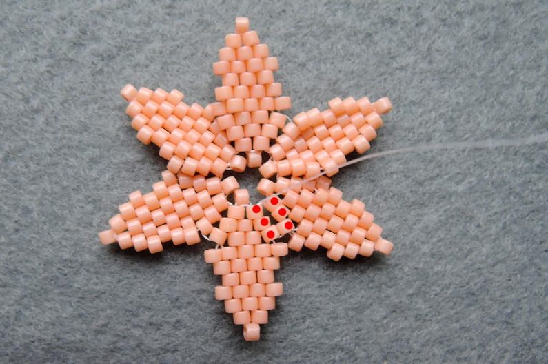 Nit vychází z jednoho ze středových korálků. Navlékněte si voskovou perli, jeden MD11, vraťte se zpátky voskovou perlí a prošijte protilehlý středový korálek. Můžete ještě jednou zopakovat, aby byla perlička důkladně připevněna. Poté nit zapošijte a ustřihněte (obr. 19).