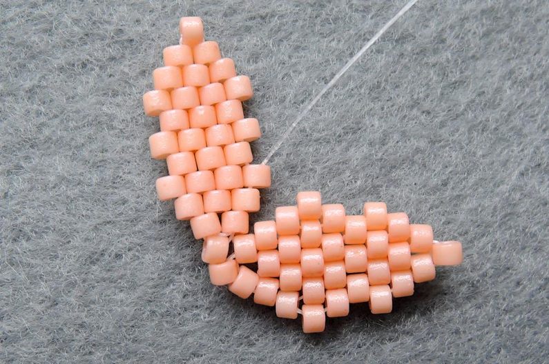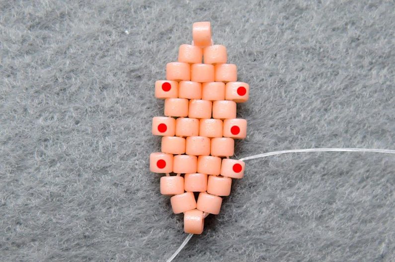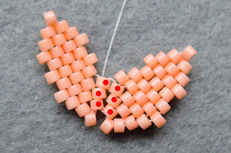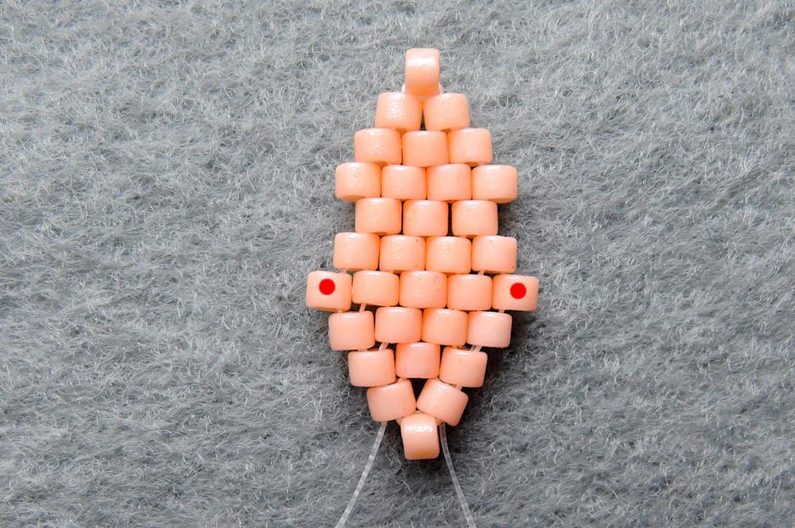 4. řada: V tomto kroku přidáte pouze po jednom MD11 v mezeře ve spodní části lístečku – celkem tedy pouze 2 MD11 a nití pak vyjeďte z MD11 z dvojice MD 11 (obr. 7).