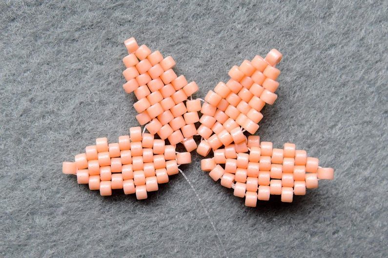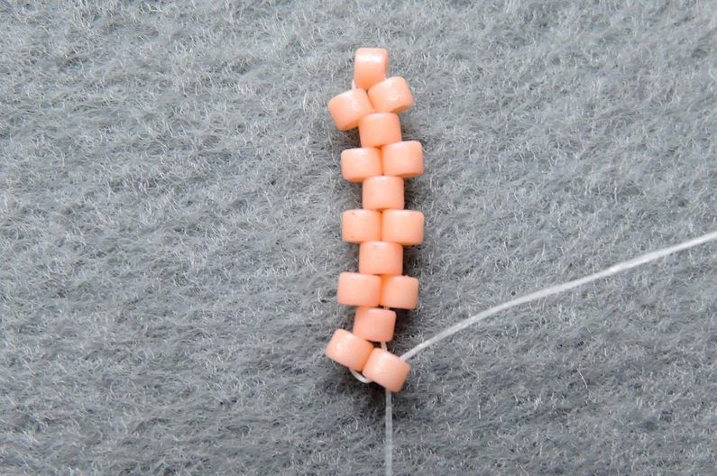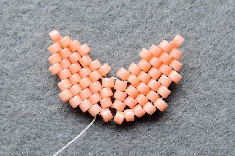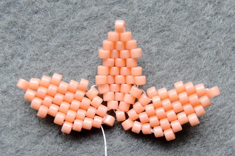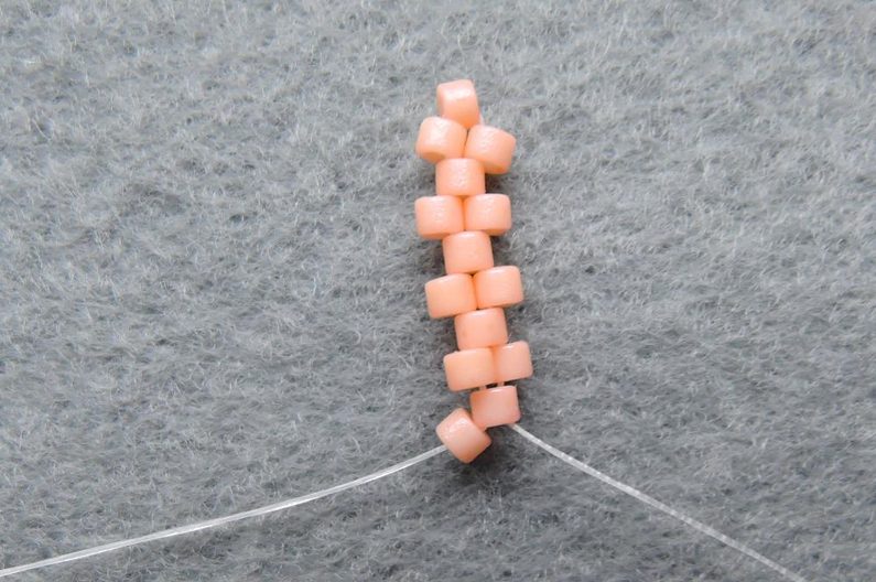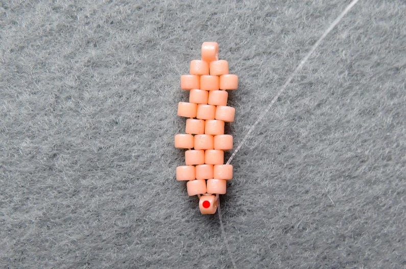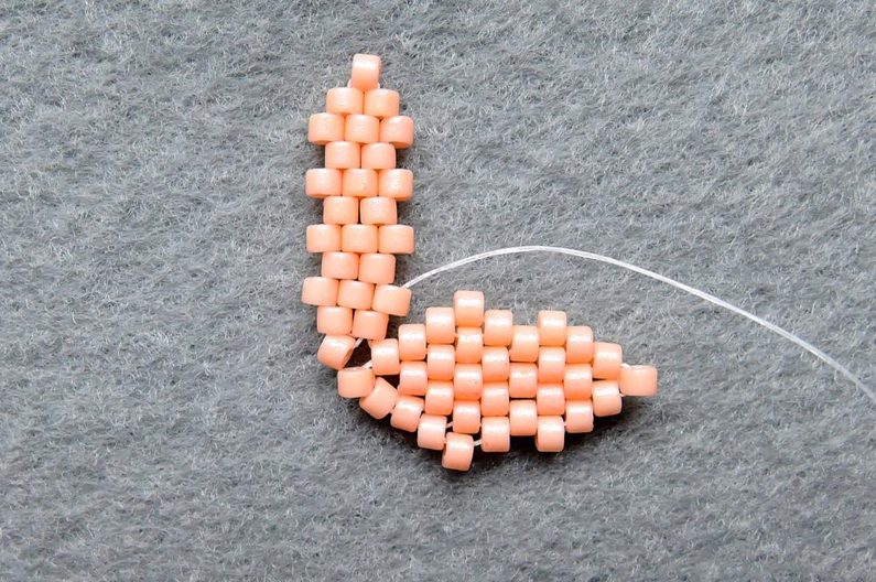 1. řada: Navlékněte 8 MD11, poté ještě další 3 a 8. navlečeným MD11 se vraťte zpátky (obr. 1). Mezi každý druhý MD11 přidejte po 1 MD11 – celkem 3 ks (obr. 2). Nyní navlékněte ještě jeden MD11 a vraťte se směrem nahoru úplně prvním přidaným MD11 (obr. 3).