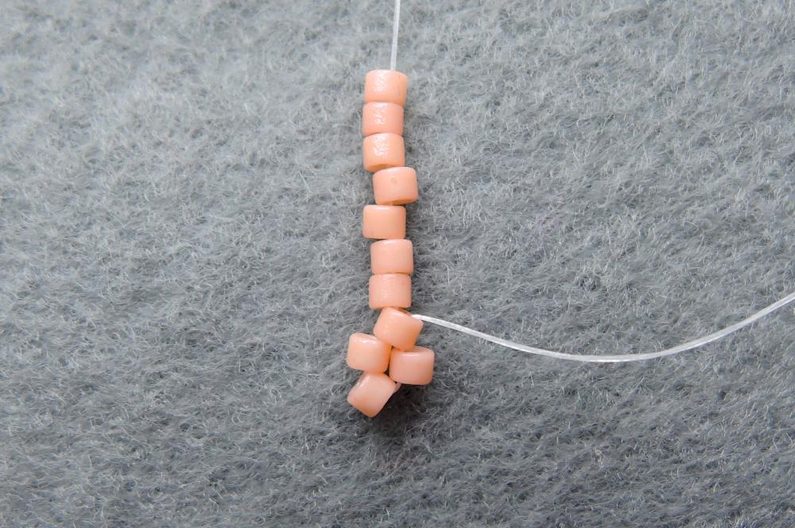 Ustřihněte si cca 1,2 metru Fireline a navlékněte jehlu. Na jedné straně si nechte pouze kousek šňůry dostatečný na zapošití a budeme pracovat delším koncem.