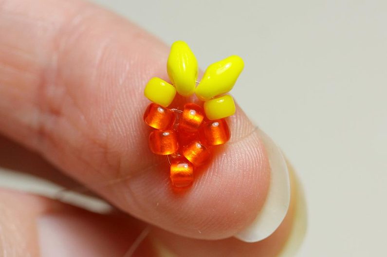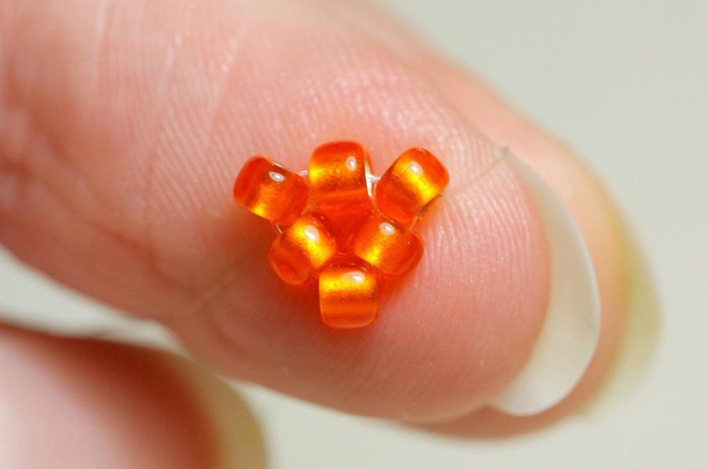 Náušnici si opět otočíme a jehlu protáhneme vrchní dírkou aktuálního MS. Mezi oba MS všijeme 3x TR8. Jehlu s vlascem protáhneme bez navlékání následujícími korálky, abychom se dostali k dalšímu vrcholku z MS, mezi něž opět všijeme 3x MS, takto opakujeme po celém obvodu. Zapošijeme vlasec.