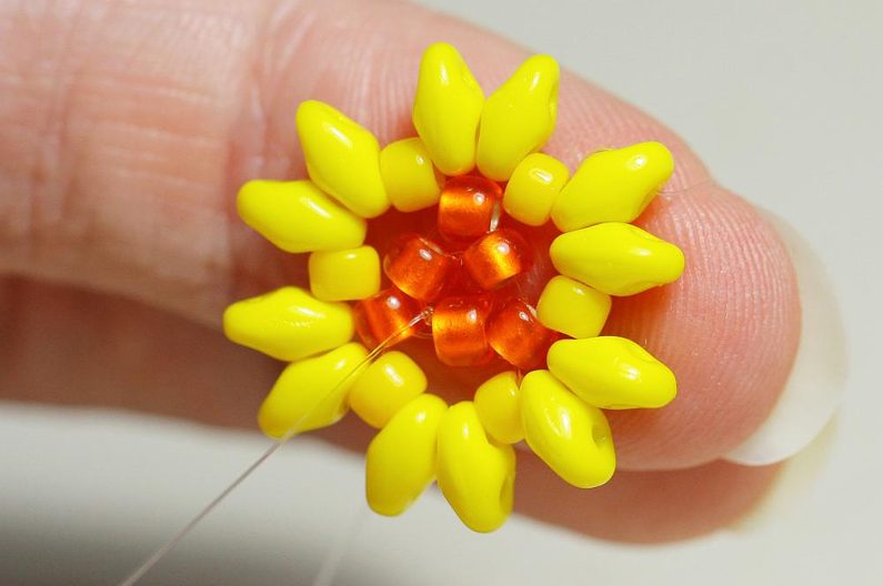 Jehlu protáhneme následujícím TR8 a dvěma MS, kytičku si otočíme „rubem“ nahoru a jehlu protáhneme druhou dírkou MS. Všijeme 2x MS mezi obě horní dírky MS.